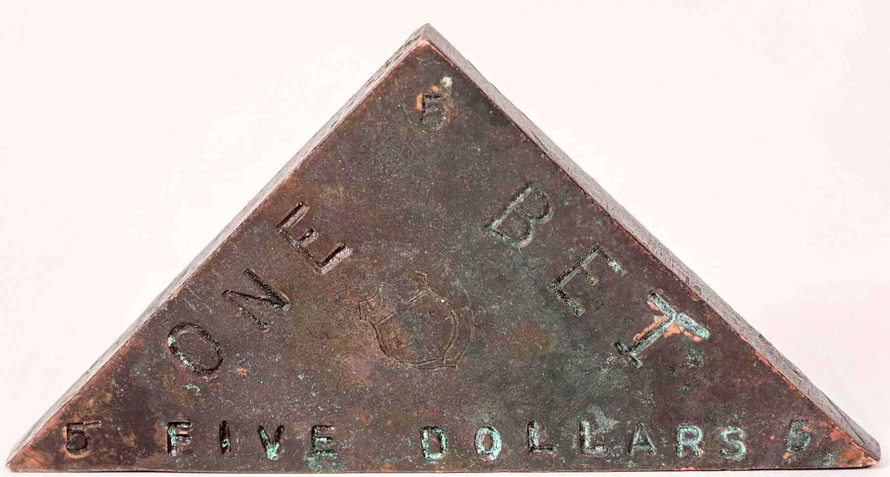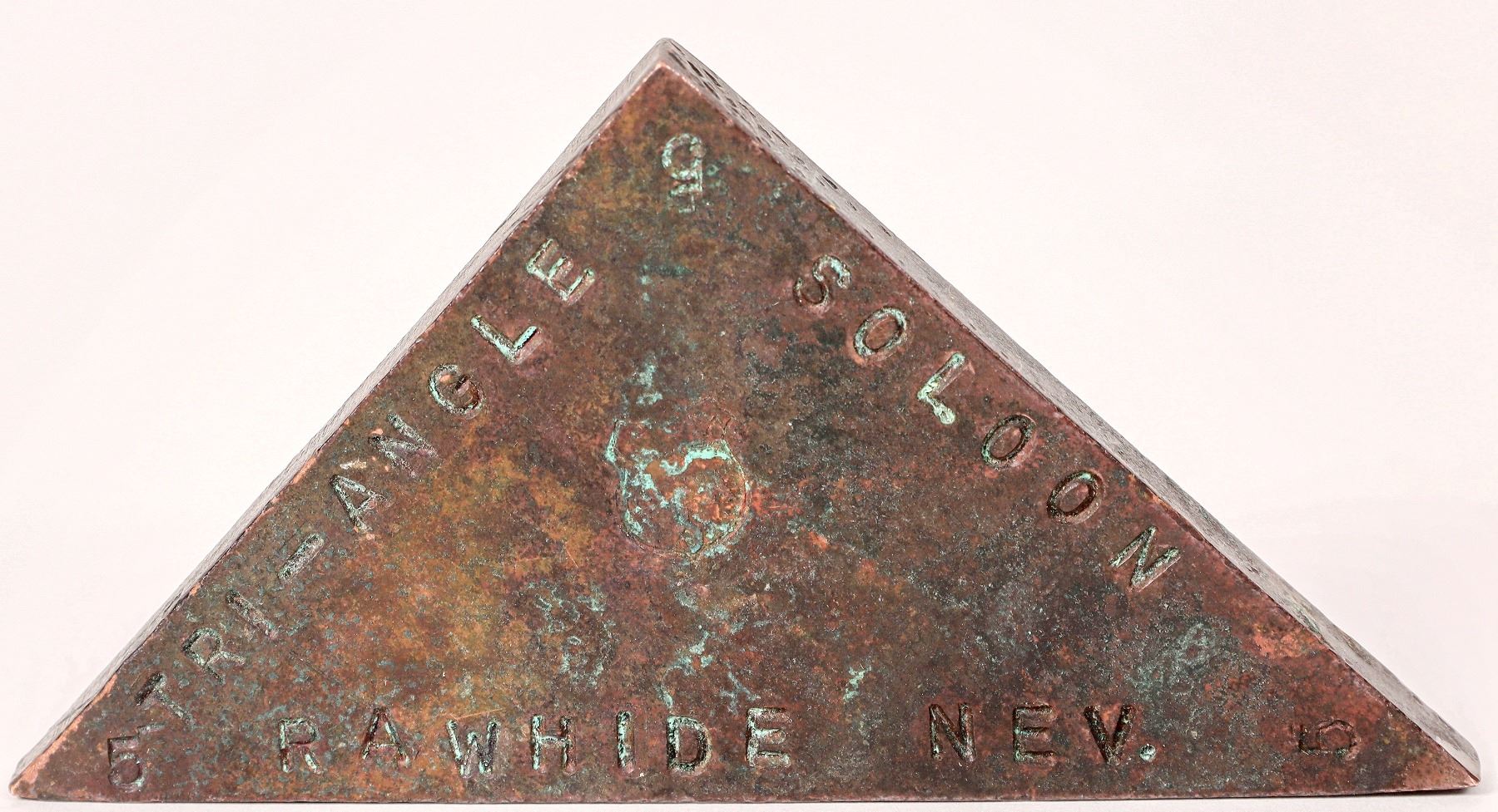 Triangular piece of copper, 1/4 inch think, with punched letters" Triangle 5 Soloon (sic) 5// 5 Rawhide, Nev.// One 5 Bet 5// 5 Five Dollars 2 3/4 x 2 3/4 x 3 3/4" 136.2 grams. Dark brown oxidation. Origin unknown. Date unknown. Highly unlikely to be a legitimate piece from the 1907-8 height of the Rawhide mining camp, as ingots of this value were nearly always in precious metal, or the metal of the mining camp, and that was gold for Rawhide. Is it a fantasy piece made at the time sold for fun at the bar to touring miners or prospectors? Was it dug in a Rawhide dump before the open pit mine consumed the entire town of Rawhide? Was it made by a clever person as a fantasy in the 1960s? Regardless, it is a fun display piece invoking lots of discussion. Rawhide Nevada