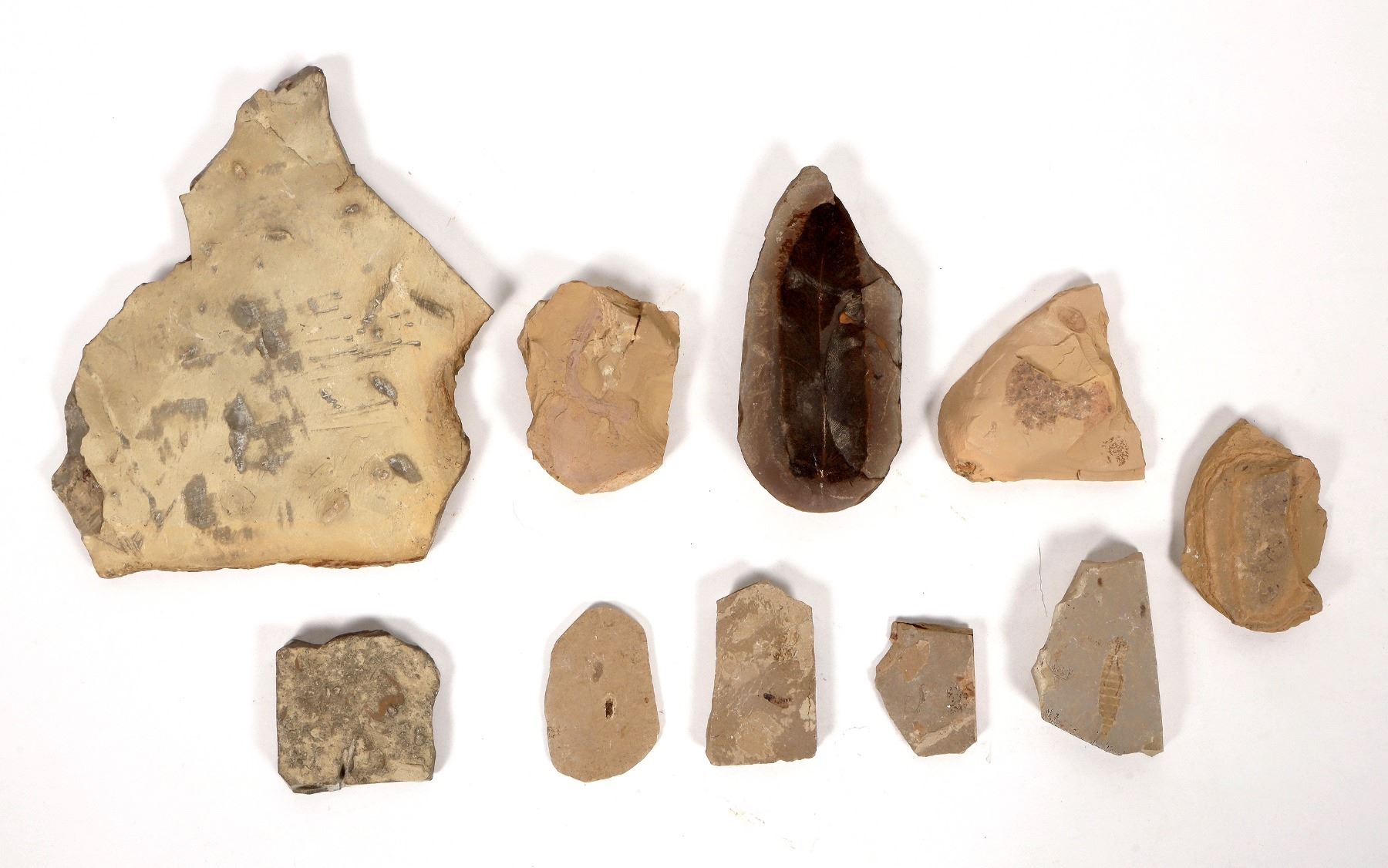 A group of 10 fossils including trilobites and trilobite hash. Millions of years old. Slabs. Largest piece is 9" x 6", smallest is 2" x 1.5".