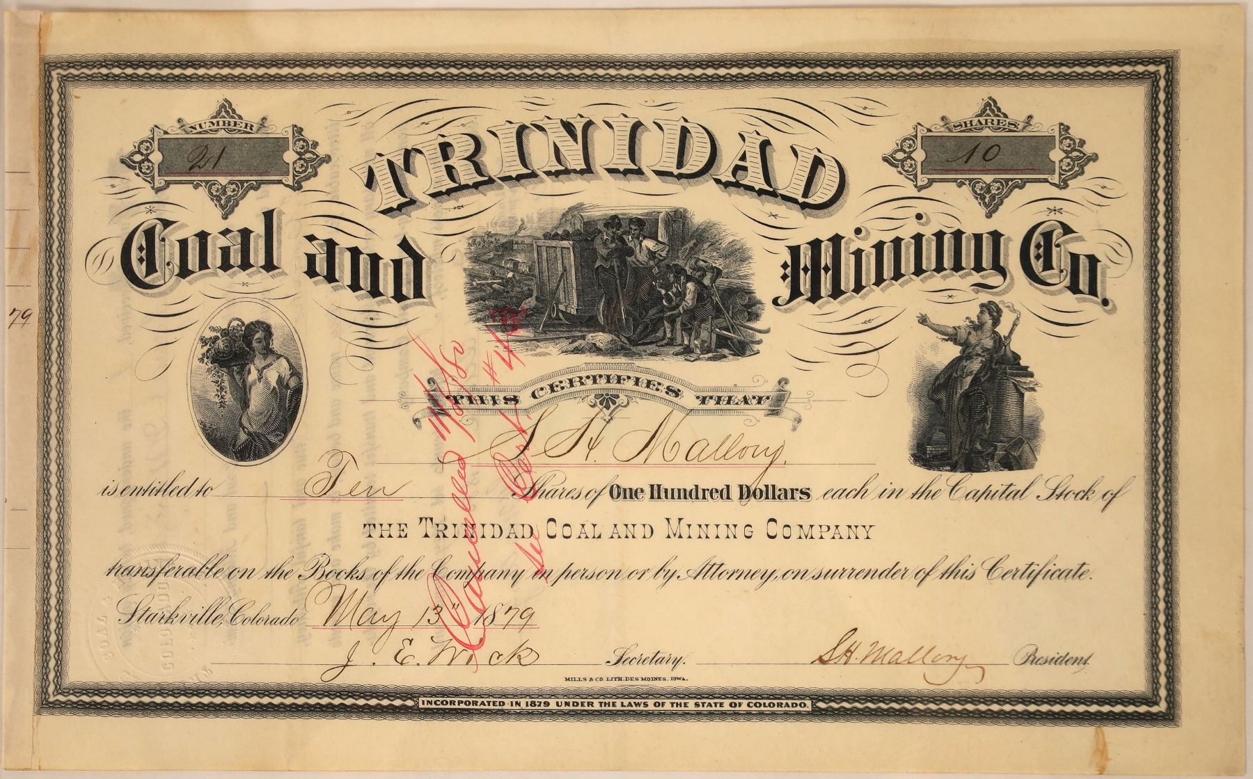 Very rare and exciting stock from the Trinidad Coal and Mining Company issued at Starkville, Colorado in 1879. Issued to and signed by the president, S.H. Mallory. Three vignettes including a nice mining vignette at the top. The coal fields of Trinidad covered 600 square miles. Trinidad was incorporated in 1876 and became the supply and transportation center for the region's coal mines. The coal from these mines was highly prized for its quality in creating coking fuels for Colorado's smelters. As the mines and smelters of Colorado grew into a major industry, Trinidad prospered and became a wealthy commercial center full of stunning Victorian homes and buildings (westernmininghistory.com). This certificate is an exciting find and very rare. Red pen canceled. VF.