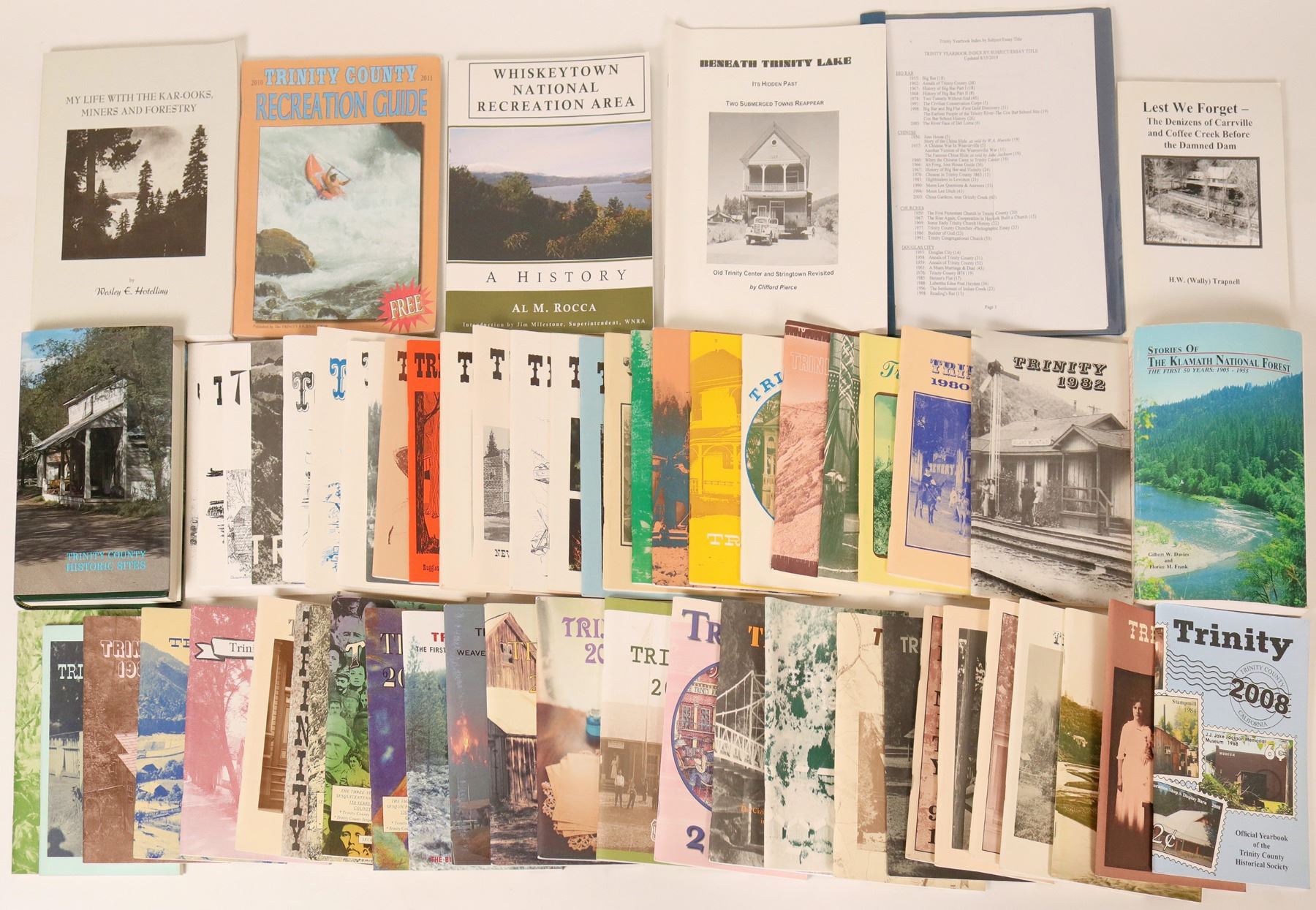 Lot of about 60. Includes: 52 different Official Yearbooks of the Trinity County Historical Society, 1955-2009, possibly with none missing; Stories of the Klamath National Forest, Davies and Frank; Trinity County Historic Sites 1981 hc w/ dj; My Life with the Kar-ooks, Miners and Forestry, Hotelling, sc; and others.