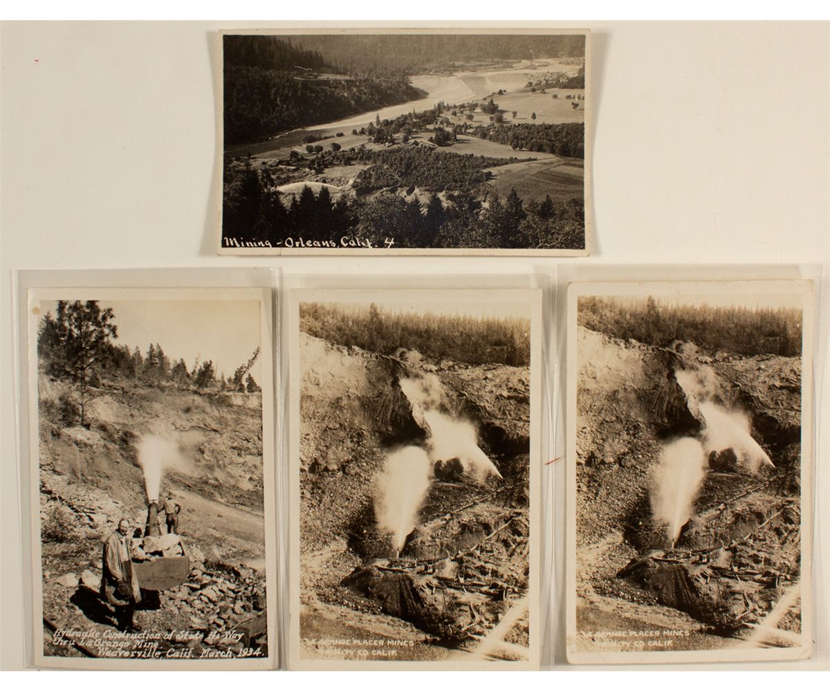 Group of 4 black and white hydraulic mining postcards from the Prag collection. 1) Two "Le Grange Placer Mines Trinity Co. Calif," one postmarked 1946; 2) "Mining - Orleans, Calif. 4"; 3) "Hydraulic Construction of state Hi-Way thru La Grange Mine. Weaverville, Calif. March, 1934."