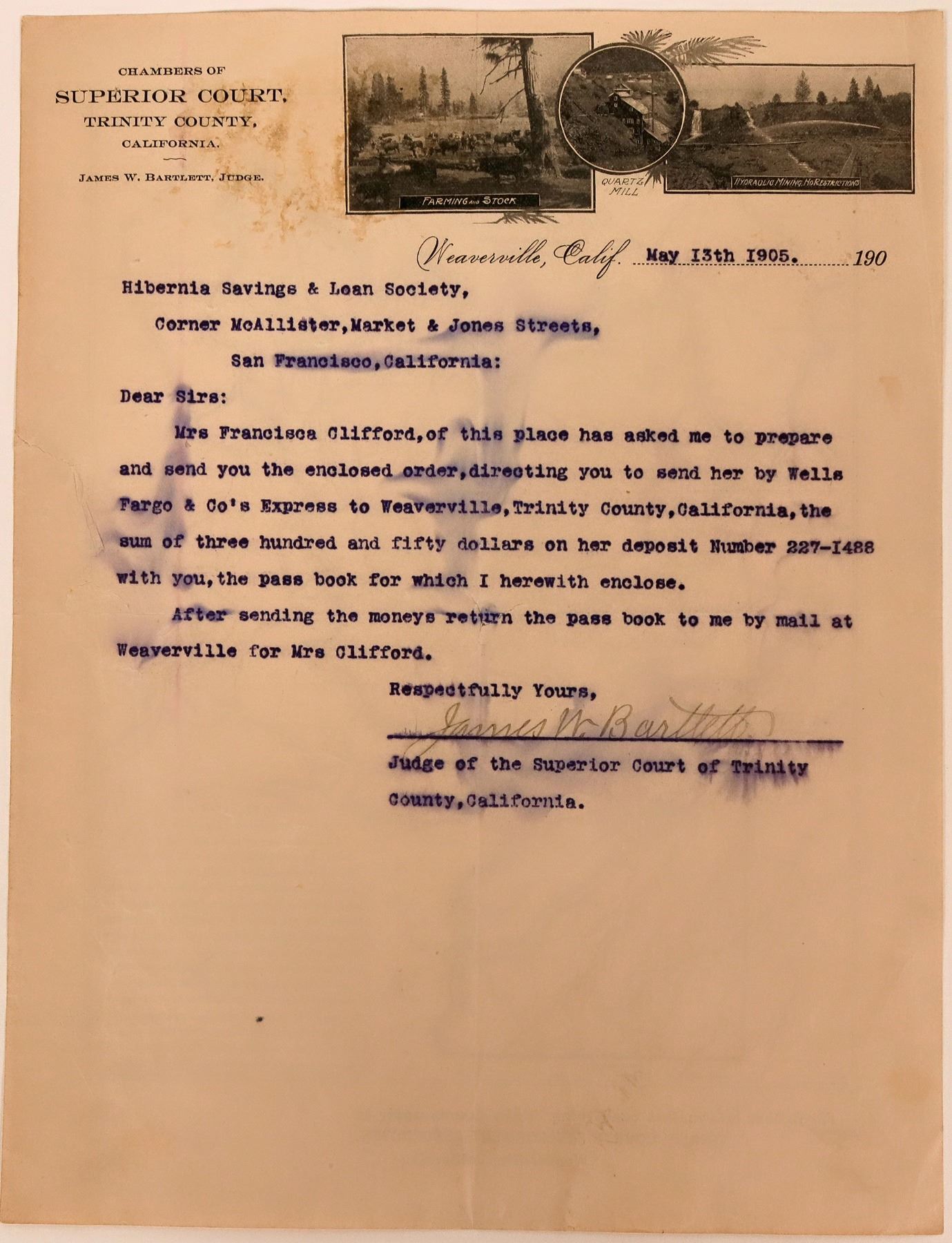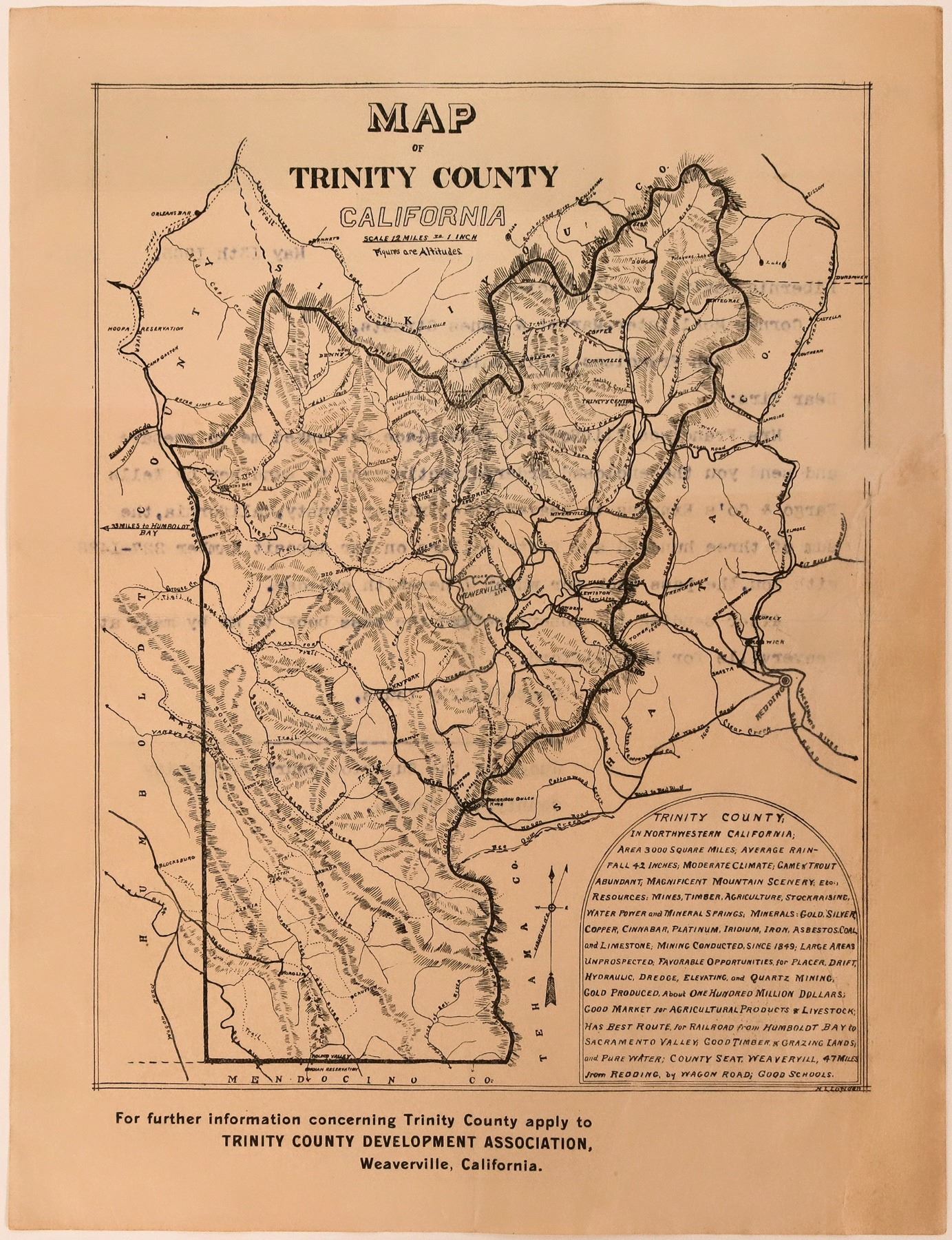 Map and corresponding letter from Chambers of Superior Court, Trinity County, California dated May 13th, 1905. Trinity County Development Association Weaverville, CA