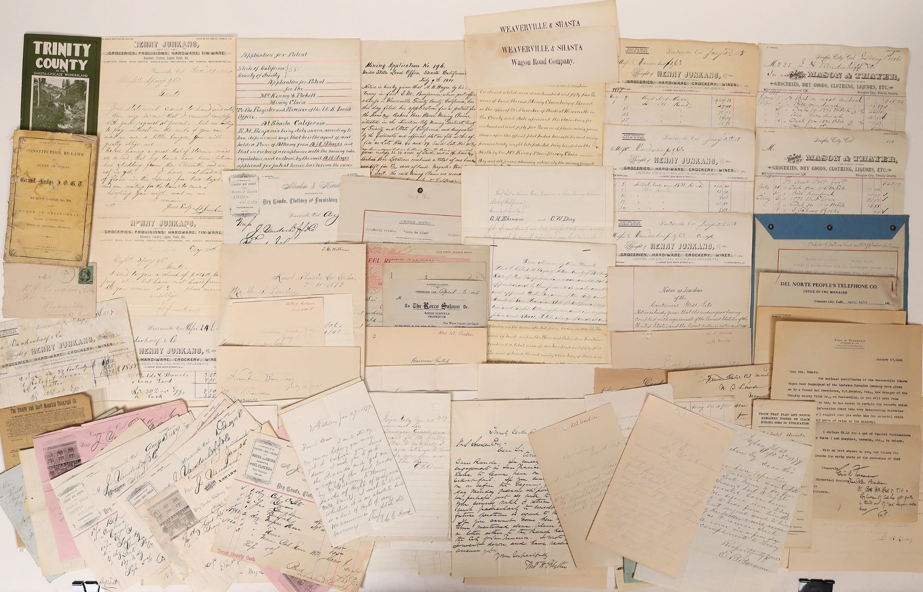 About 55 pieces of ephemera from Trinity, Humboldt and Del Norte Counties, c. 1868-1915. Billheads and letterheads, some pictorial, IOOG 1868 booklet, quartz claim legal doc, mining application etc. Weaverville, Trinidad, Crescent City, Cinnabar, Shasta, etc. Trinity, Humboldt, Del Norte California