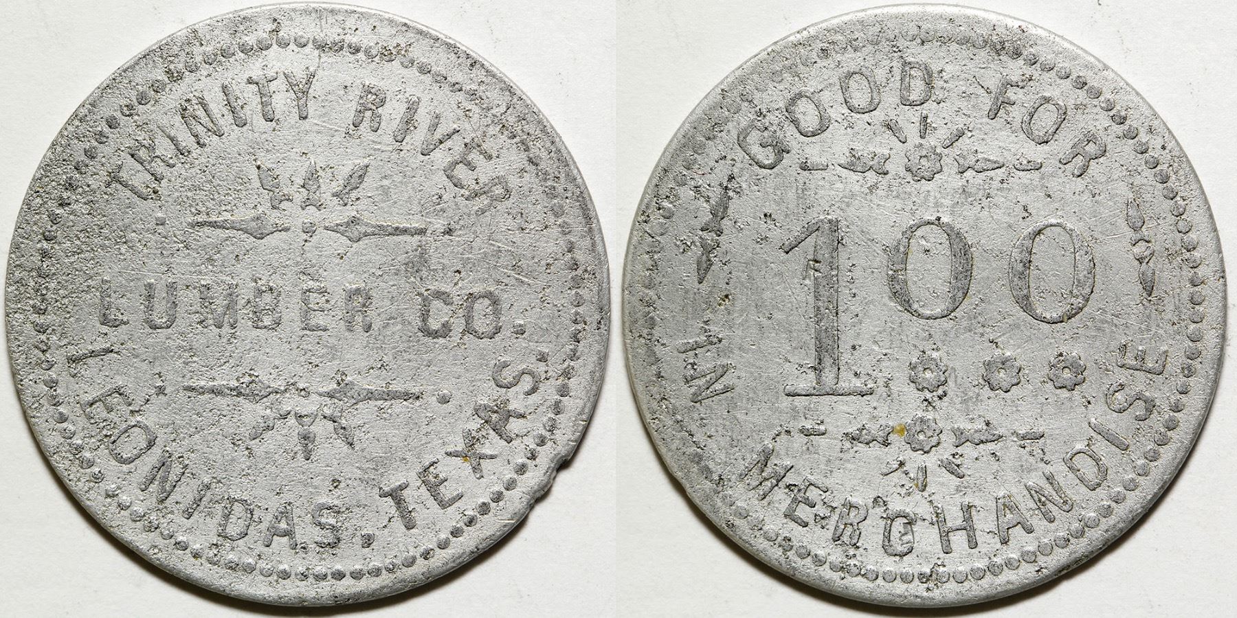 Round aluminum 35mm, TRINITY RIVER/LUMBER CO./ LEONIDAS, TEXAS//GF/ 1oo/ IM. 1 of 2 different merchants, scarce town. HWAC# 62512 Date: Location: Leonidas, Texas