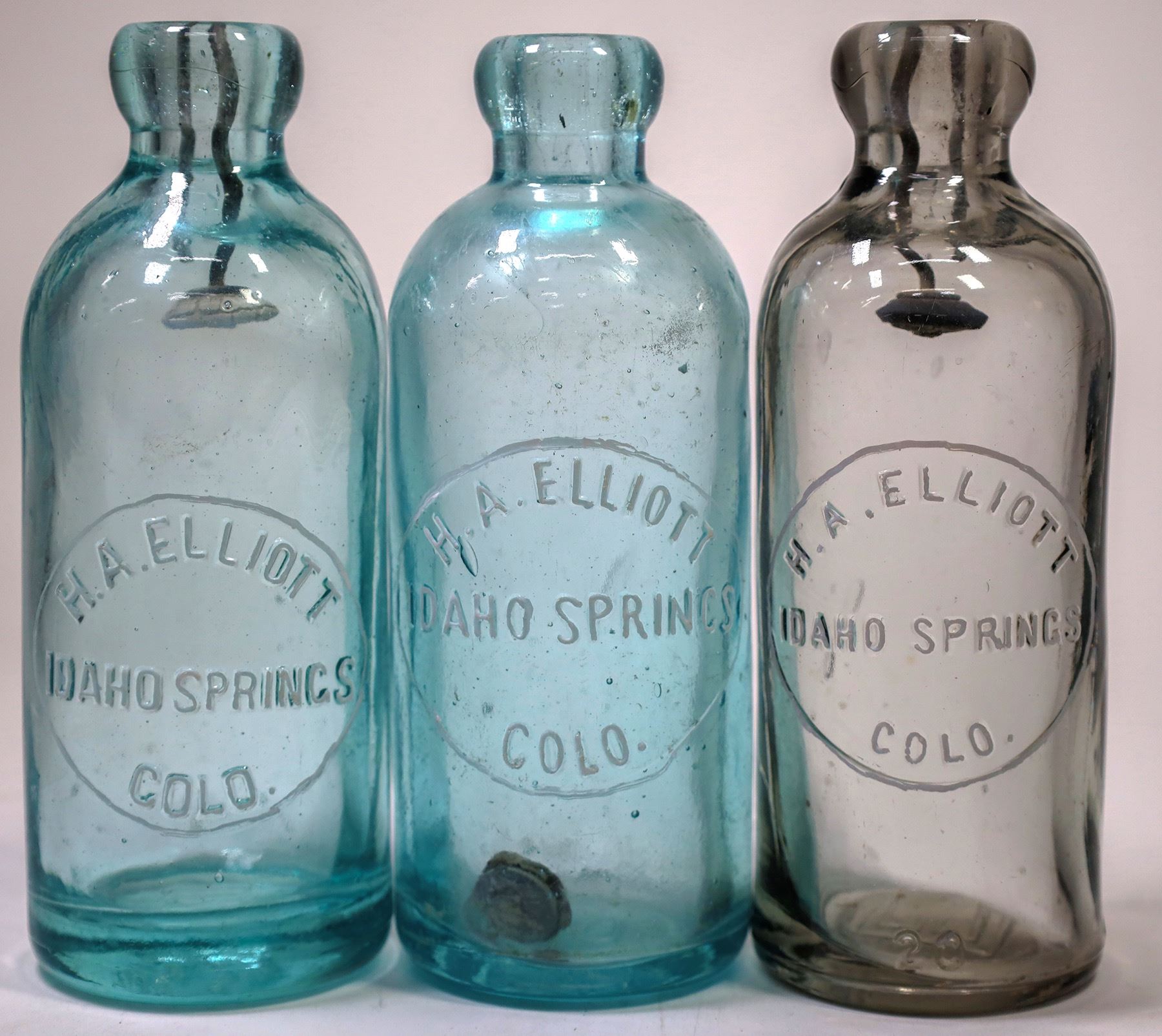 1.) H.A.ELLIOTT/IDAHO SPRINGS/COLO. S212, c. 1898-99, aqua in color 6 3/4", with pinprick bubbling and white residue scratch marks within the bottle. Number 20 on the bottom & signs of wear around the base. Dirt around the inner rim of the lip. Part of the metal piece remains in the bottom of the bottle.
