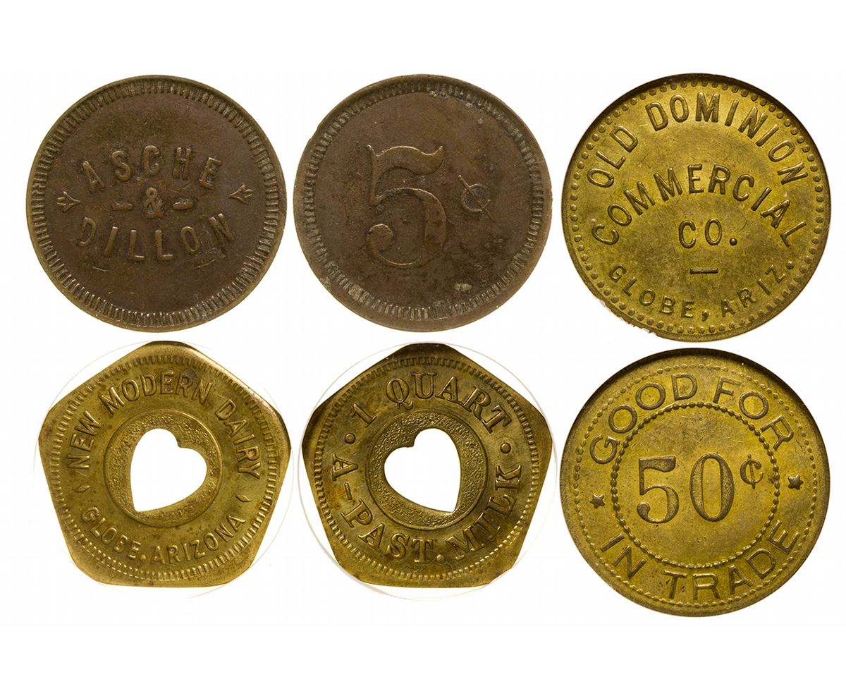 Lot of 3: 1) Obv.: New Modern Dairy / Globe, Arizona; Rev.: 1 quart / A-Past Milk; NGC MS65; octogonal, heart cutout; 2) Obv.: Asche / & /Dillon; Rev.: 5c; NCS genuine; 3) Obv.: Old Dominion / Commercial / Co. / Globe, Ariz.; rev.: Good For / 50c / In Trade;NGC MS 65.