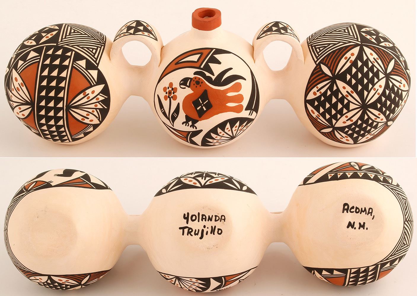 Triple Canteen, Yolanda Trujillo. 4.5" h c 12". Yolanda has been making pottery for about 30 years. She began by helping her mother, Becky Pasquale, when she was 8 years old.Like most artisans, skills and knowledge is exchanged, and Yolanda credits her grandmother and aunts with also helping her learn her art.This vessel seen is a fine examples of the Acoma potters art. Date: Location: Acoma Pueblo, New Mexico HWAC # 52151