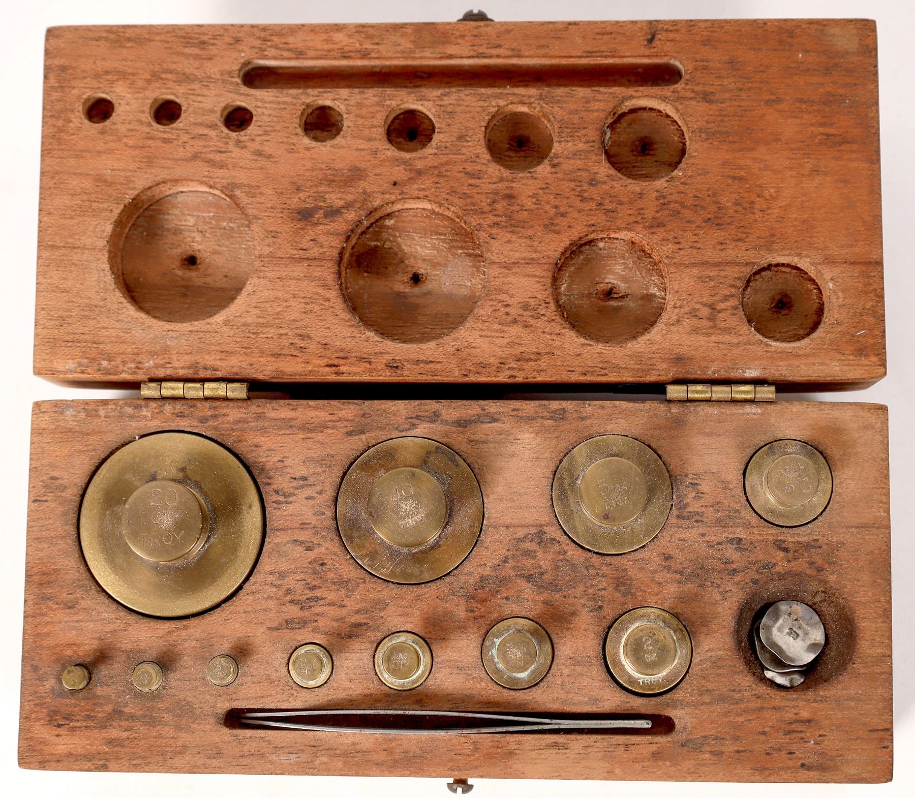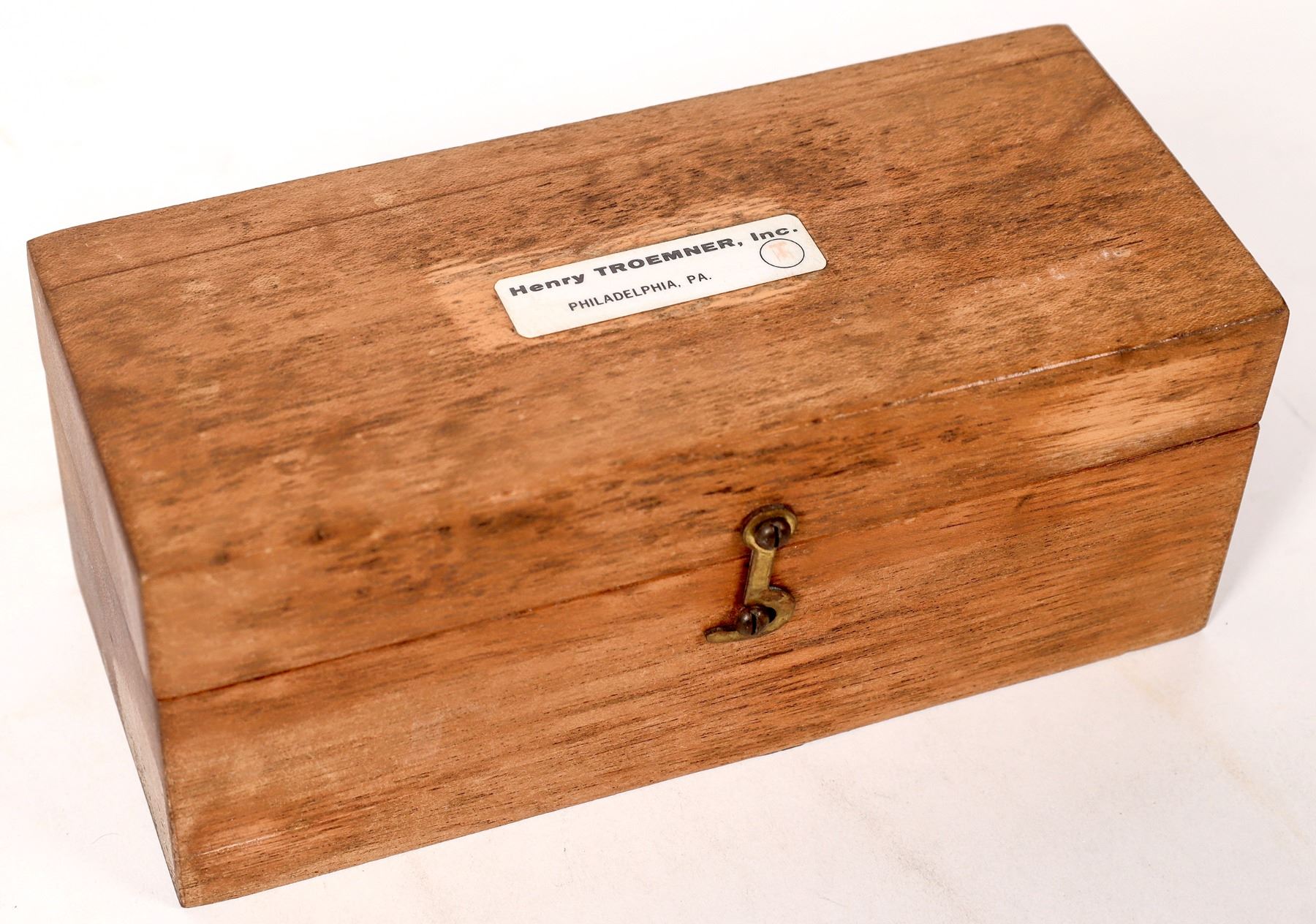 Weight set for larger balance up to 20 Troy ounce. The set seems to be complete and is in a nice wood box. It measures 3.5"x 4"x 8". It has The Henry Troener Inc. name plate. It's in nice condition. Please see photos for more details. Philadelphia Pennsylvania Franklin Collection