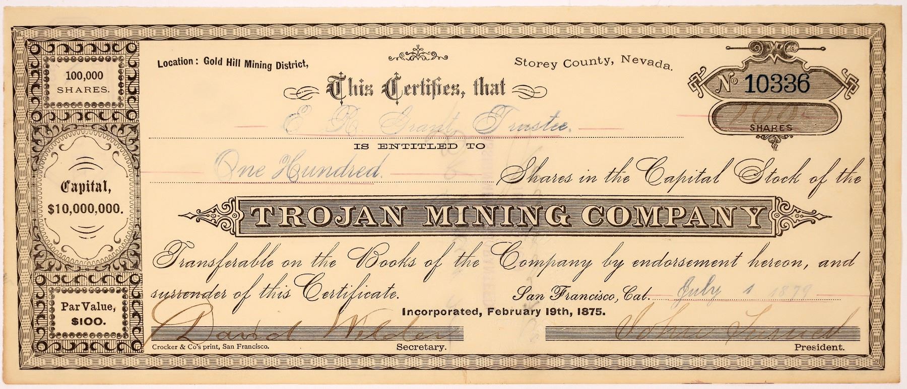 Trojan Mining Company - Gold Hill Mining District, Storey County, NV - Certificate # 10336 for 100 shares made out to E. R. Grant, Trustee datelined San Francisco July 1, 1879. Incorporated Feb. 19, 1875, and capitalized at $10,000,000; 100,000 shares at $100 per. Signed by secretary David Wilder and President, Munroe Turner. 1500 feet; Shares per foot, 66 2/3. The mine is located west of the Overman and south of the Belcher, (p. 251 Pacific Coast Mining Review 1878-79). Assessment on reverse. Printer: Crocker & Co., S.F. Gold Hill Nevada