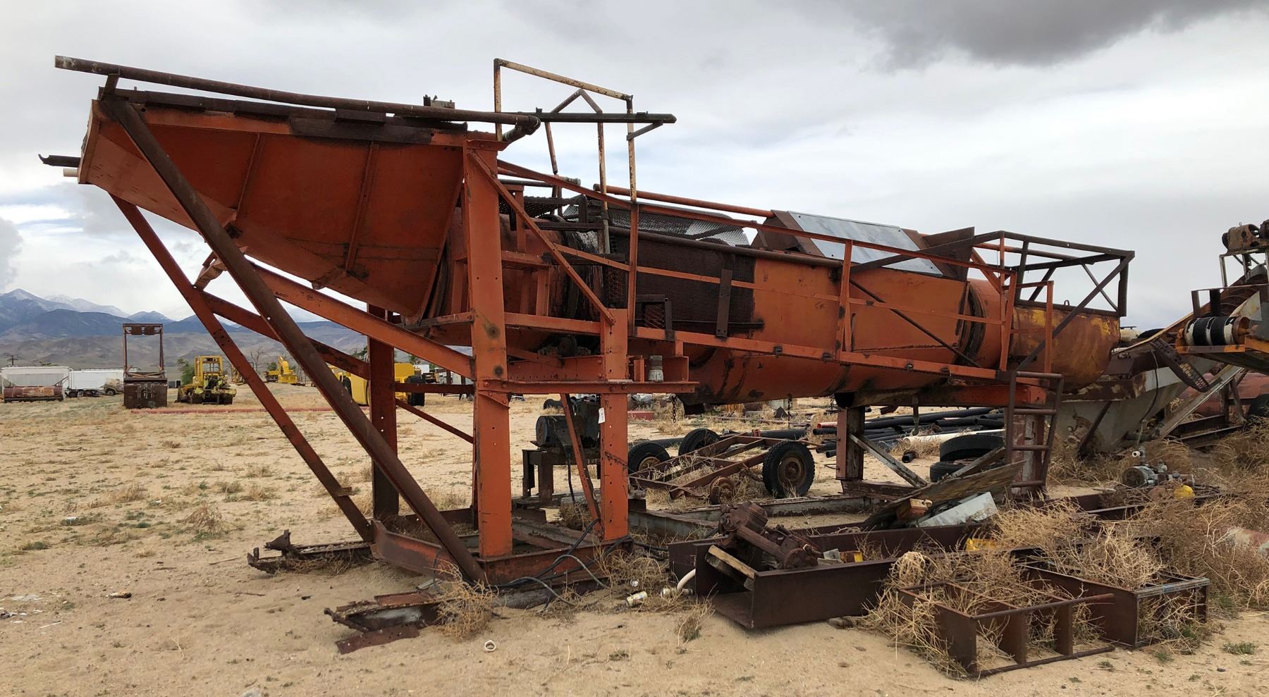 gold mining trommel, ready for flatbed truck. 4 x 6' hopper feeds 20' long trommel. not been used in years, possibly adaptable for placer work today. 12' high. please inspect. (F.O.B. Fish Lake Valley, Nevada)
