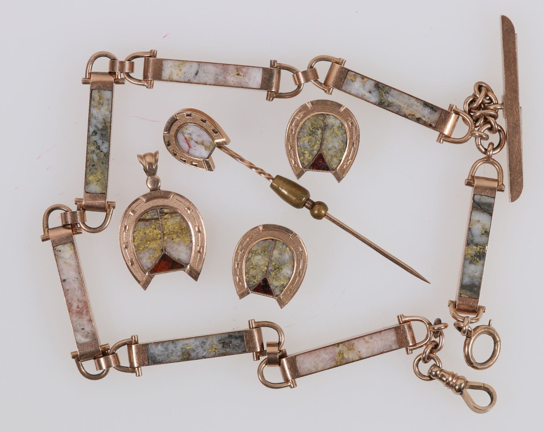 The incredible pieces in this lot include a gold in quartz watch chain with 9 separate gold in quartz pieces set in unmarked gold with a slightly rose hue that tests as 10k and measures about 15 inches in length. Each gold in quartz piece is about 1 inch. Also included are a pair of cufflinks, a stick pin and a pendant, all with gold in quartz inside engraved gold horseshoes. Pendant horseshoe measures 1 inch plus loop. Cufflink horseshoes measure .75 inches. Stick pin horseshoe measures .5 inches. Combined weight is approximately 75 grams. These are custom made pieces between 1890-1920 period from the Comstock, likely worn as trophy pieces by Schnitzer as proprietor of the famous Nevada Brewery and Senate Saloon. Consignor of these pieces is the great grandson of Schnitzer. Remarkable set.