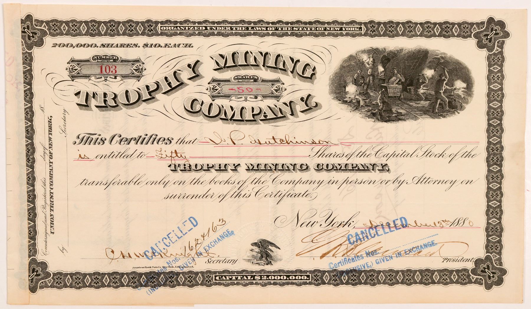 Inc. in New York. No. 103, issued for 50 shares to JP Hutchinson on Dec. 13th, 1880. Signed by the president (Blanchard) and secretary (McKnight), stamp cancelled signatures. Black border and print, vignette of miners working with lamps. Printed by ABN.6.75 x 11.5" Folds, stub attached. According to E&MJ Vol. 34 (1882), the company worked the Trophy and Seventy-Nine Lodes in the Leadville District. However, the company is described in the 1883 Colorado Mining Directory as operating the same lodes in Summit County on Sheep Mountain. They own 9 claims: the Trophy, Seventy-nine and Yellow Jacket, situated on the south slope of Sheep Mountain; and the Neusitz, Lone Dane, St. Elmo, Little Bertie, Little Aldenburg, and Arctic Light on the SE slope, near Robinson in the Ten-mile District. Claims located in 1870. Developments include 20 shafts from 20-200 ft. deep plus several drifts [C&L, 1883, pg. 875]