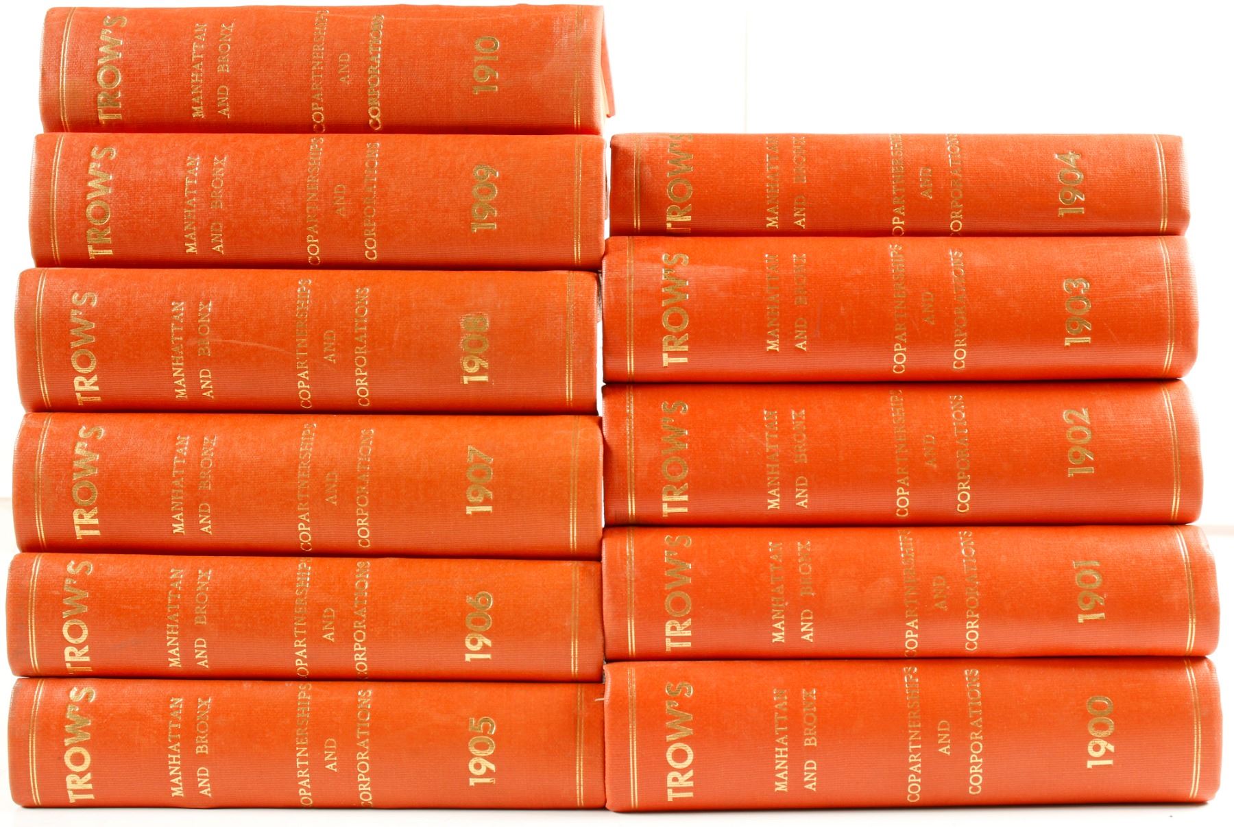 Eleven Trow's Corporation Directories for 1900-1910. Orange binding, fine. Excellent reference for the boom years after the big gold/silver discoveries in the West. City: New york State: New York Date: HWAC# 81144