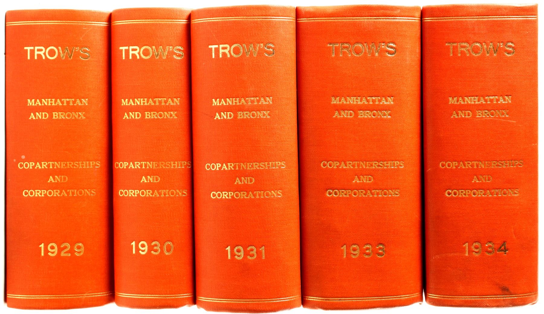 The Depression years of Trow's directories. 1929, 1930, 1931, 1933, 1934. All excellent condition. City: New york State: New York Date: HWAC# 81142