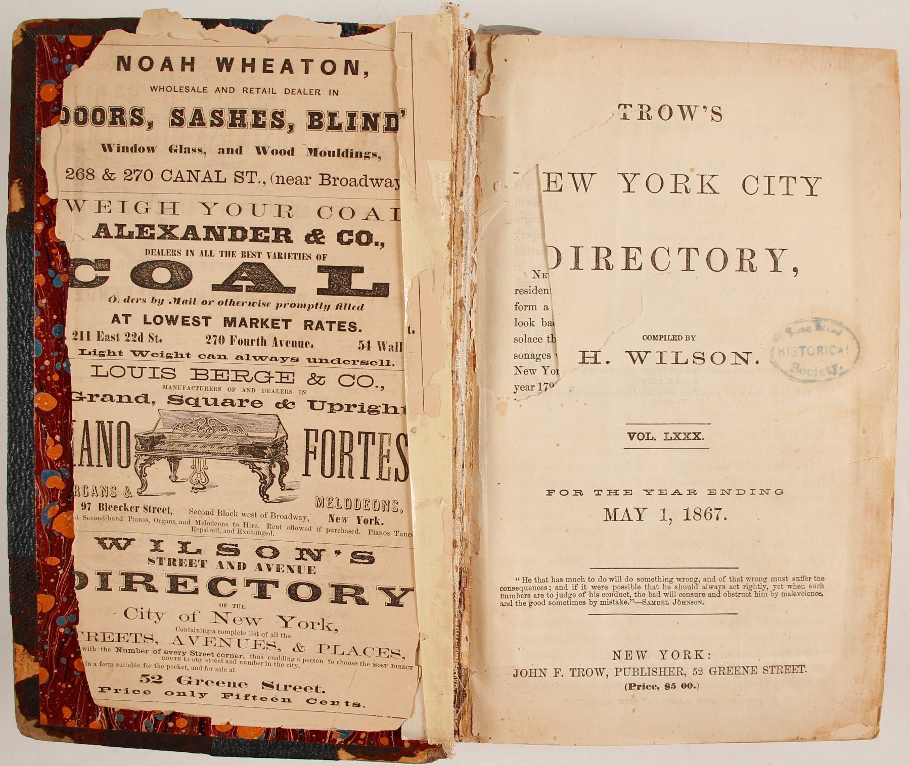 Cover boards are detached, and binding is split. Some pages are damaged. 1119 pages plus more than 100 pages of advertisements. New York New York City 1867 The Fred Holabird Collection New York City New York The Fred Holabird Collection