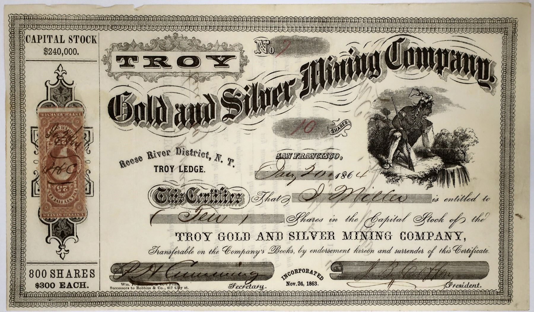 Early number 7 for 10 shares to J. Miller the superintendent. He endorses the back and it looks like he gives over his ten shares to C. Ryland. Signed by secretary P. H. Cumming and president J. B. Coffin. Dateline January 20, 1864 San Francisco. Incorporated November 24, 1863. 25c Power of Att'y revenue stamp. Not cancelled. Location: Troy ledge, Reese River District, N.T. Shares $300 each. Native American vignette. Printer Wm. P. Harrison - successor to Robbins & Co. One smear right border (original?). This certificate would show up on a delinquent list. Miller was one of the first to arrive in Hot Creek in 1867, built the first mill in Hamilton c1869 and was superintendent of the General Thomas at Columbia in 1878.†More notes on Miller and assessment included.