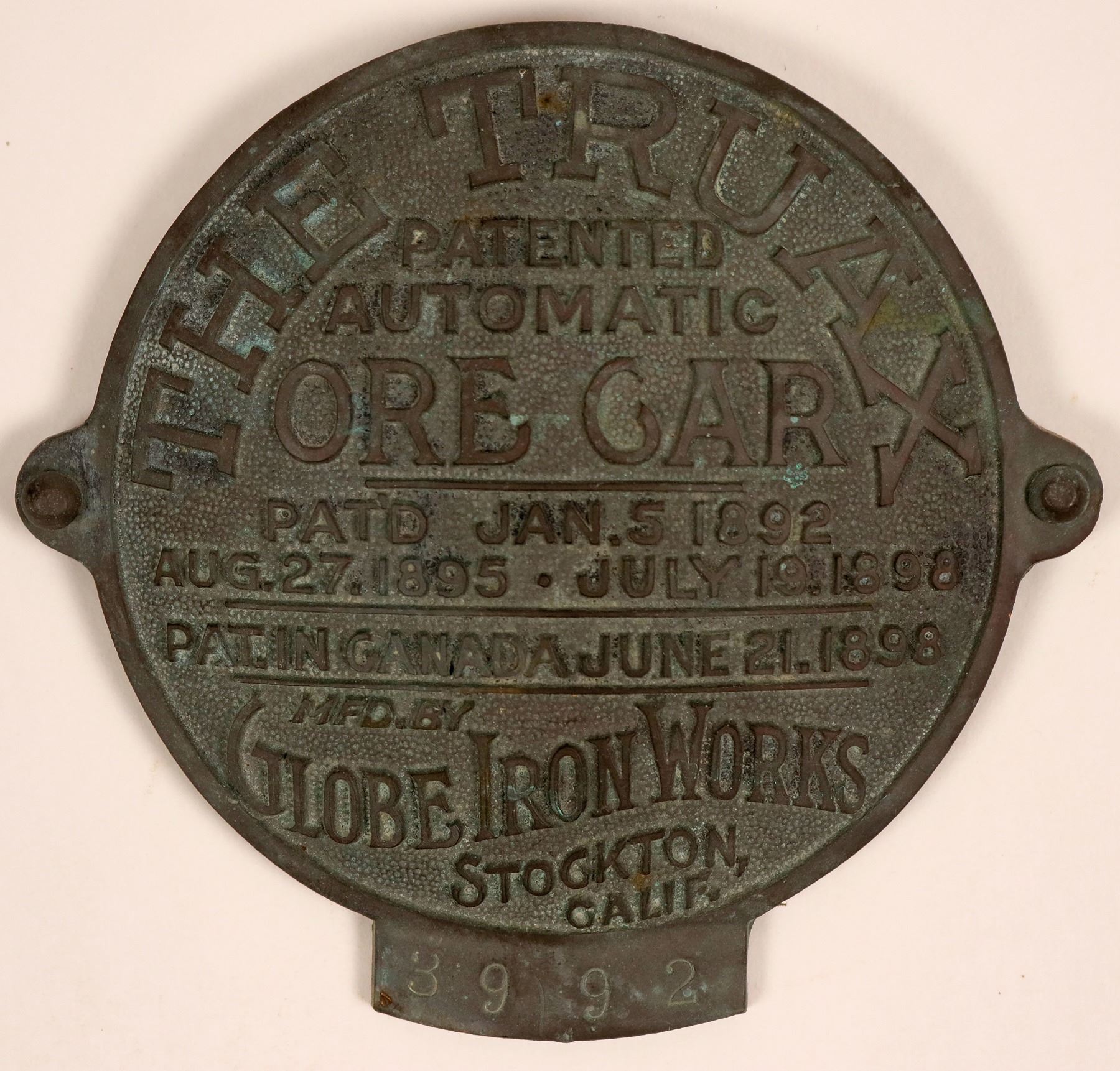 The Truax / Patented / Automatic / Ore Car / Pat'd Jan. 5 1892 / Aug. 27, 1895 - July 19, 1898 / Pat. In Canada June 21, 1898 / Mfd. By / Globe Iron Works / Stockton, / Calif. / 3992. (number 3992 stamped on bottom of tag is believed to represent the number ore car off production line.) Diameter measures 4.5". Even, light green patina. Choice example of a classic ore car tag. The Truax Manufacturing Co. of Denver was a well-known supplier of ore cars and other ore handling equipment from the late 1800s into the early 20th century.