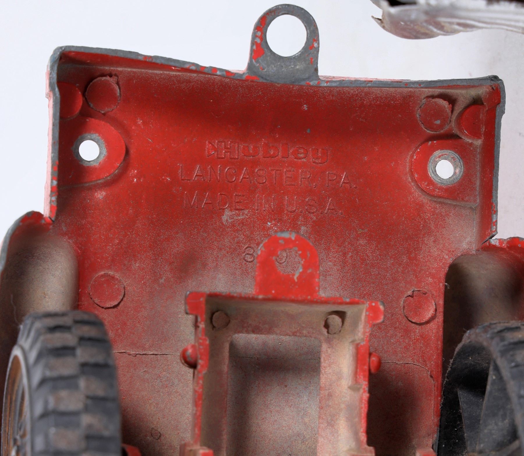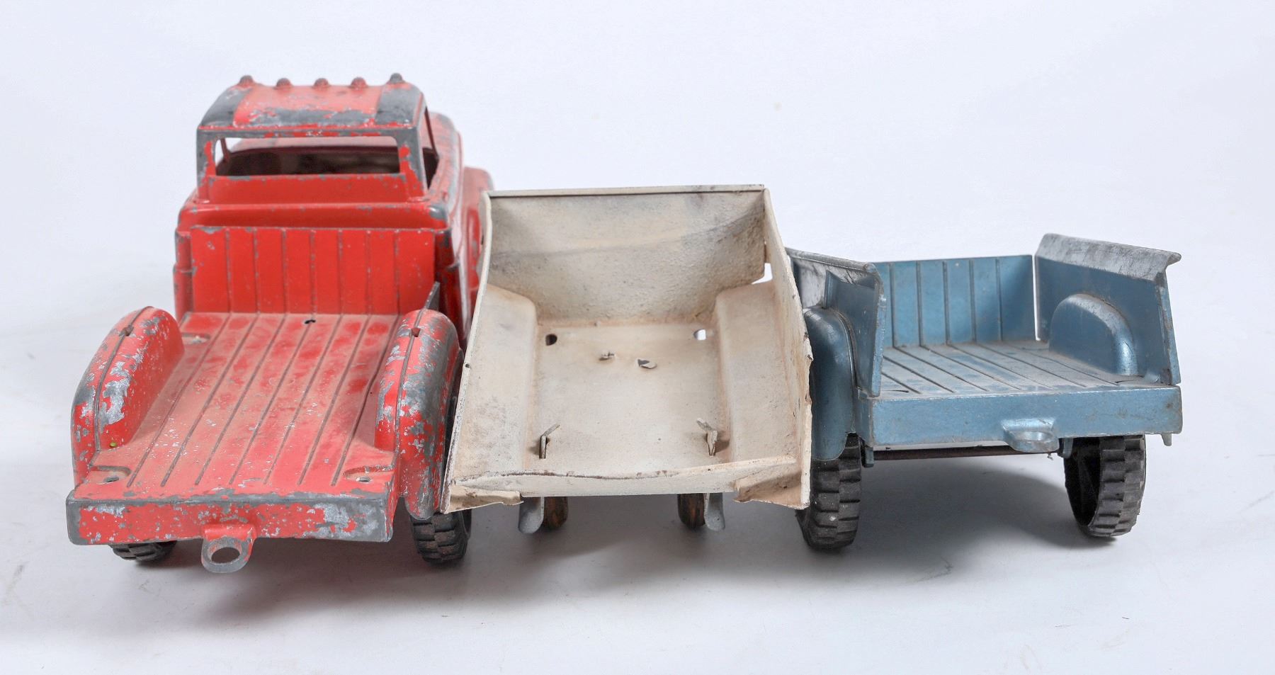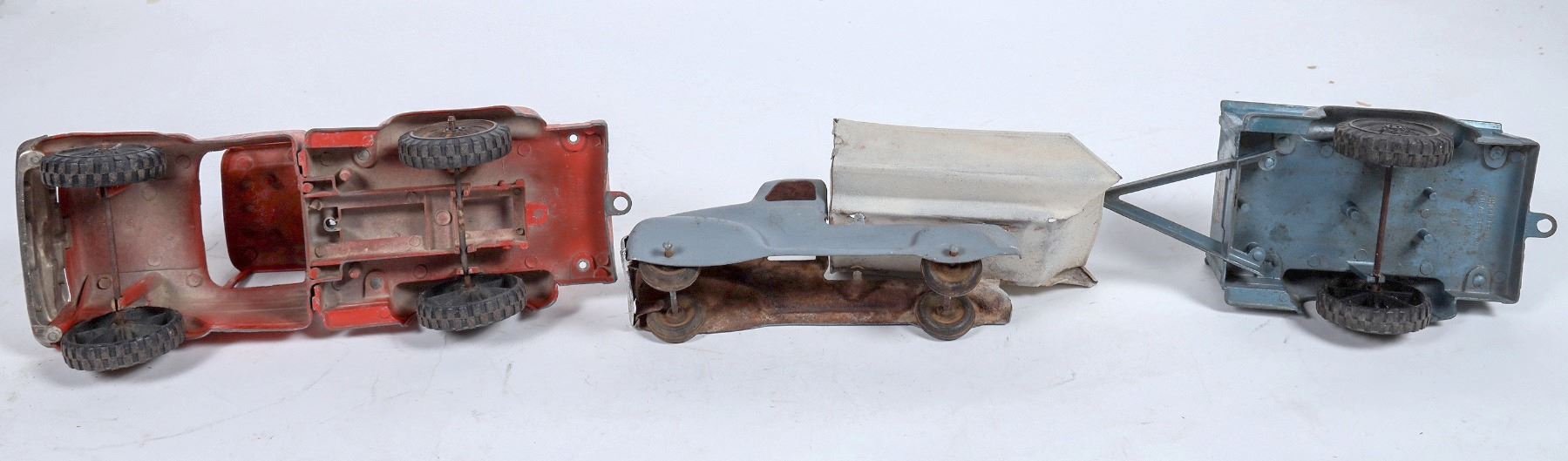 Accessory B is a soft-blue Hubley brand trailer, model #800. The graphic stickers are worn, with the paint worn, possibly rusted, on the front-left-edge of the trailer. The paint is in otherwise good condition; see photo. There's a small crack where the trailer hitch runs beneath the body of the trailer, and it is unclear whether the crack runs into the metal or only on the paint. Please note that this trailer does not appear to attach to Truck A, though an accessory piece for attaching the trailer to the truck may be missing. Measures approximately 9" long, 4" wide, & 3.5" tall. c1950-1960s