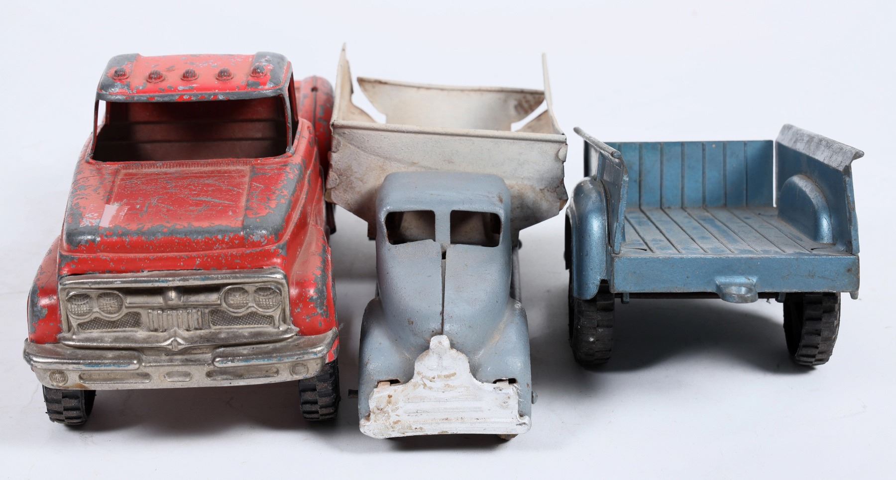 Rare pressed steel Hubley toy truck, model #900. A completely original truck with heavy playwear and three missing chrome pieces on the bed of the truck (A). The red paint on truck A is worn away in noticeable areas from years of being well loved. It measures 11.5" long, 4.25" wide, & 4.75" tall. c.1960