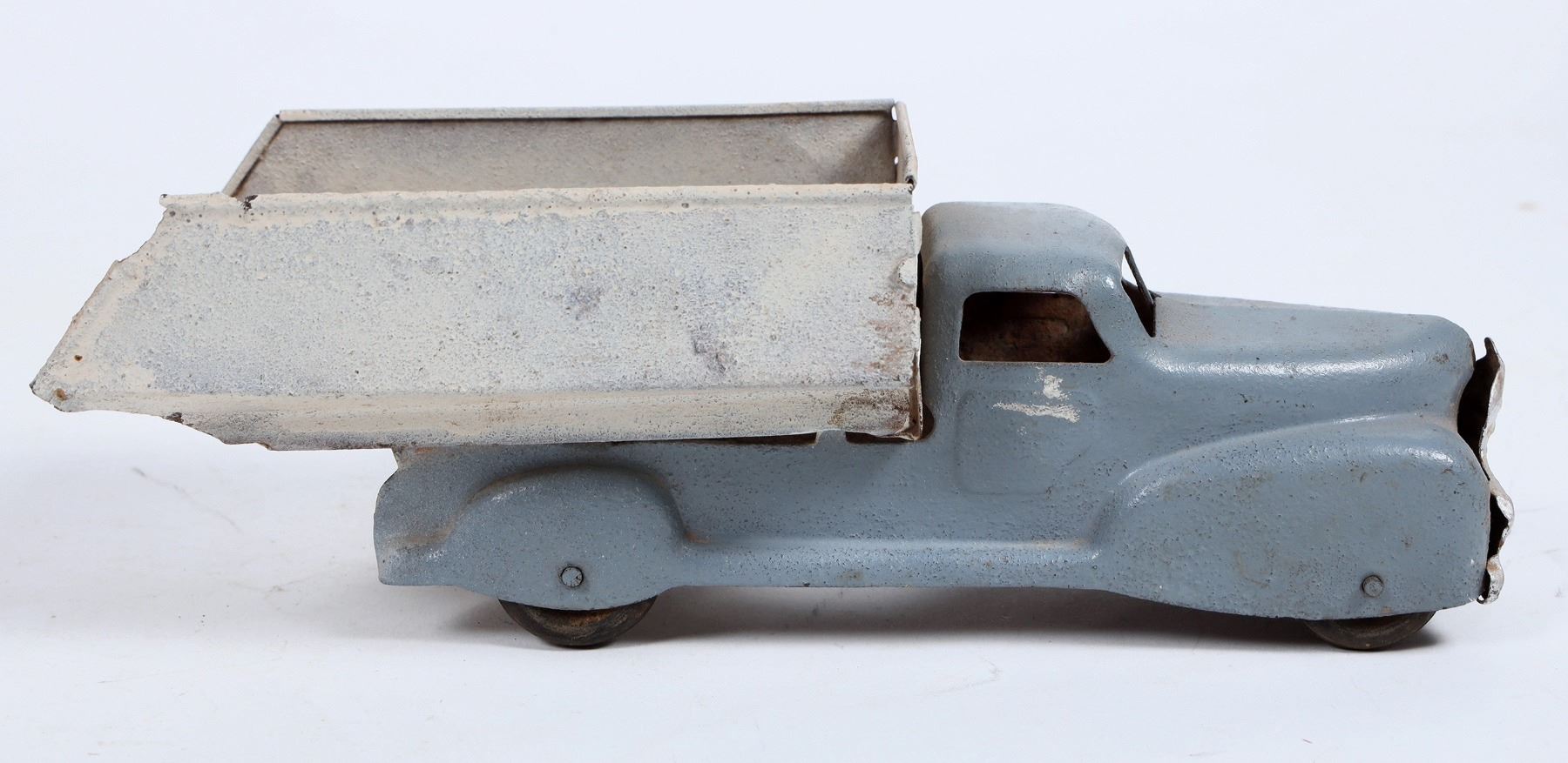 Accessory C is a repainted (blue/beige) pressed-steel Wyandotte dump truck in good working condition. The dump truck bed can be tilted back to empty a small delivery of sand, old fashion hard candy, or other small objects. Measures approximately 10" long, 3.5" wide, 3.5" tall. c.1980