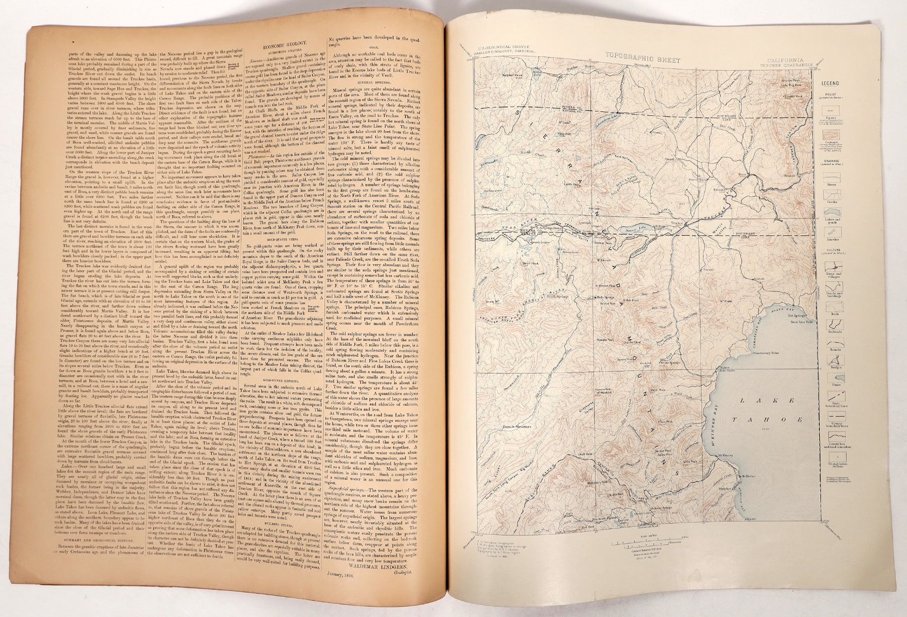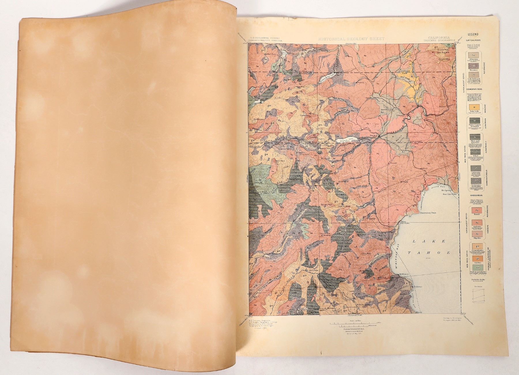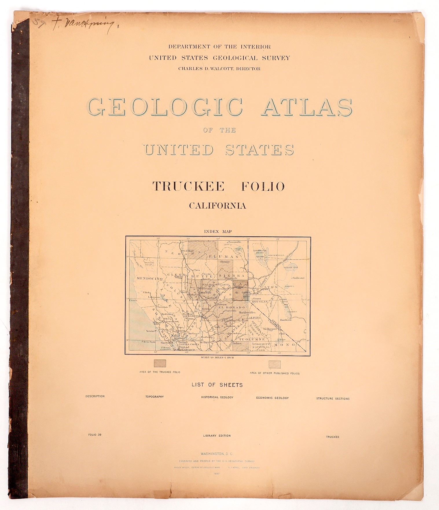 Geologic atlas of Truckee, California, published and printed by the U.S. Geological Survey in 1897. Includes pages on "description, topography, historical geology, economic geology [and] structure sections". Contains 4 color-coded maps illustrating different aspects of the district. Dark toning. Light damage at edges of cover, pages in good condition.