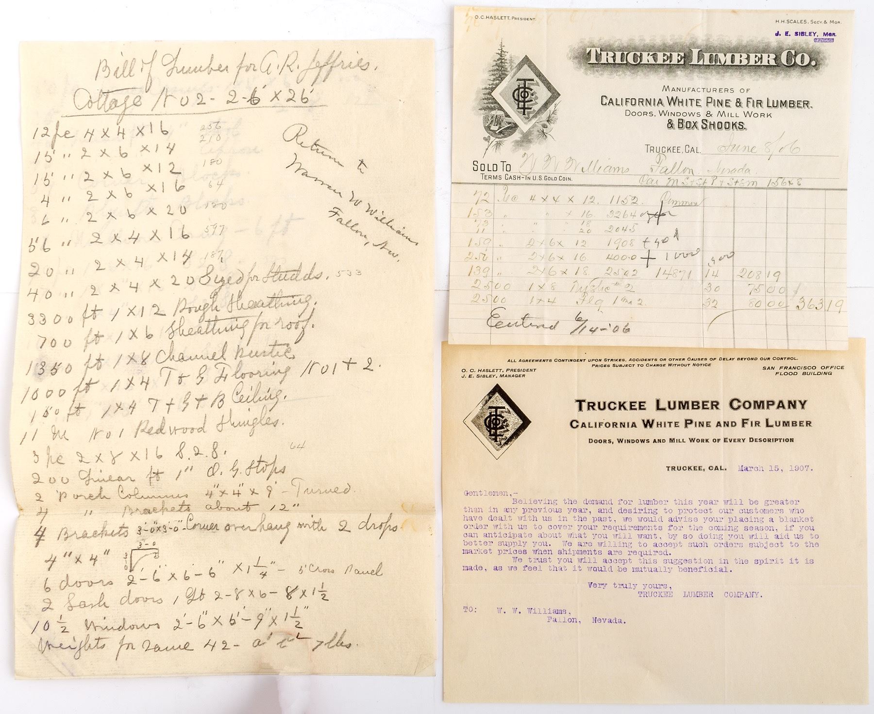 Eight 1906/07 Billheads and Letterheads from the Truckee Lumber Company. Four are for the A. R. Jeffries Cottage #2. Everything you need to build your new house. (Two pages of draft are not on billheads.) Two letterheads. One about the bid for the lumber to build the Thomas Means and the S. R. Moran houses in Fallon. Two billheads to Warren Williams of Fallon. One for $474.00 and one for $363.19. State: California City: Truckee HWAC#: 46886 Date: 1906/07