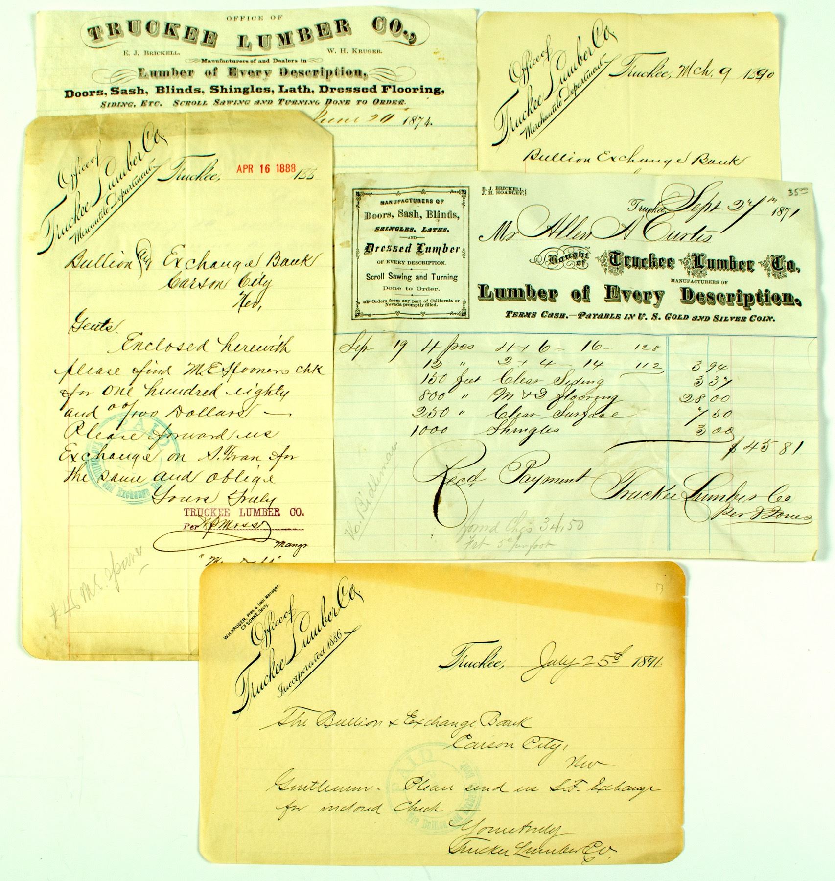 Lot of nine. 1-2) Sierra Nevada Lumber Association 1875 billheads, Addressed to the Carson (Nevada) Lumber Company. 3-9) Six different Truckee Lumber Company billheads. This is a nice collection with a wide variety of bullhead styles. State: California City: Truckee HWAC#: 48412 Date: 1871-1888