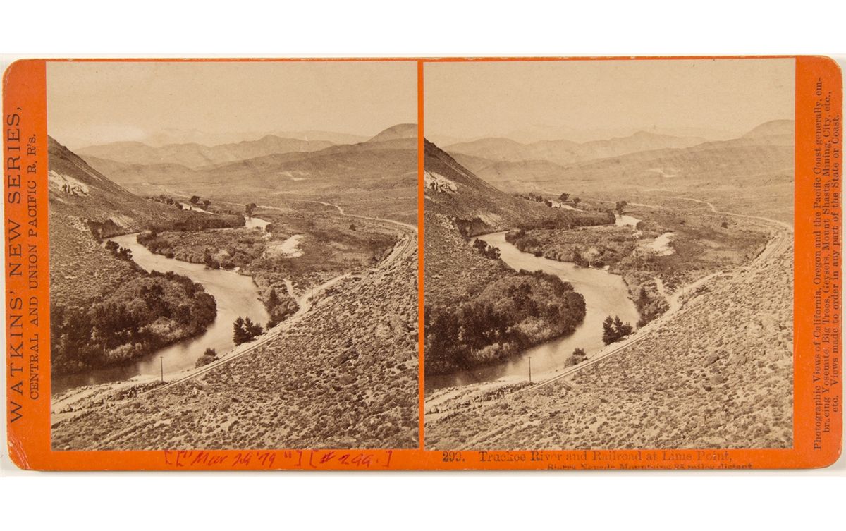 This stereoview features a great view of the Truckee River and the railroad. It was produced by Watkins' New Series. Each of the photographs measure 3.05" x 3.10" while the matte measures 7" x 3.45." The view has some wear, including some fading and creases on the corners.City: County: State: NVDate: c1870