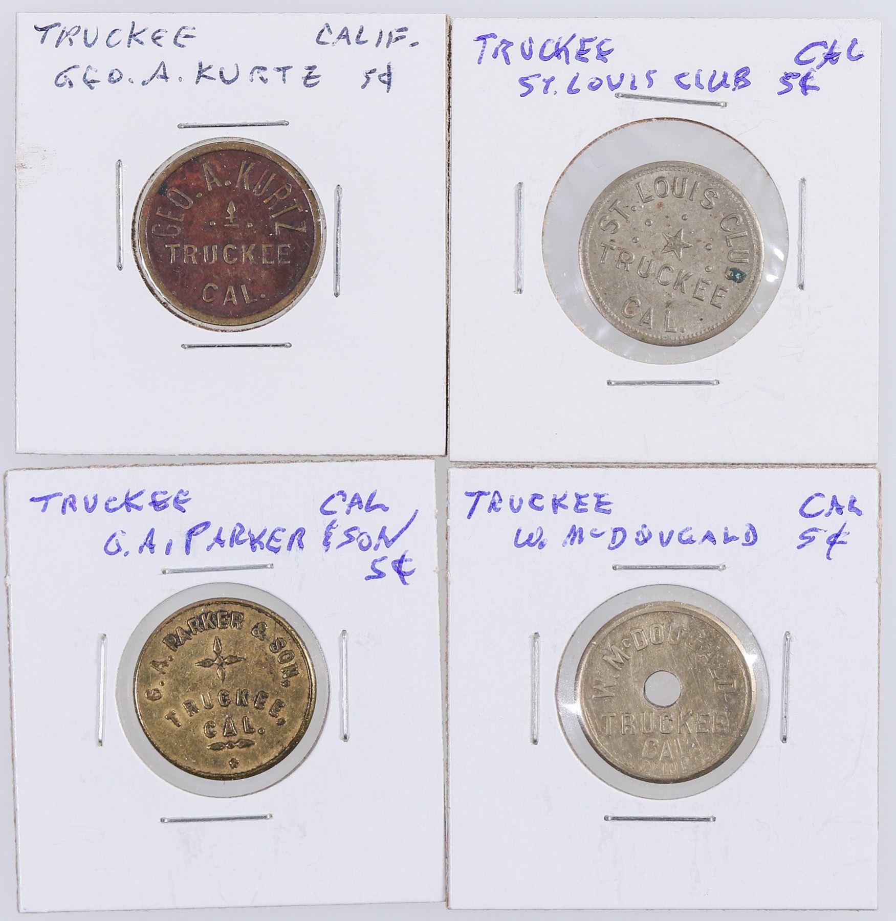 Lot of four tokens from Truckee: W. M. McDougald; G. A. Parker & Son; St. Louis Club; Geo. A. Kurtz.