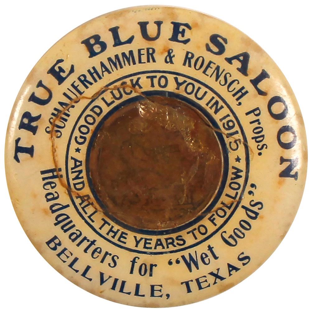 Choice saloon collectible, True Blue Saloon, Schauerhammer & Roensch, Prop., Bellville, Texas. "Good Luck to you in 1915". Possible tear around the cent, possibly replaced. This is a true rarity! Date: Location: Bellville, Texas HWAC# 56015