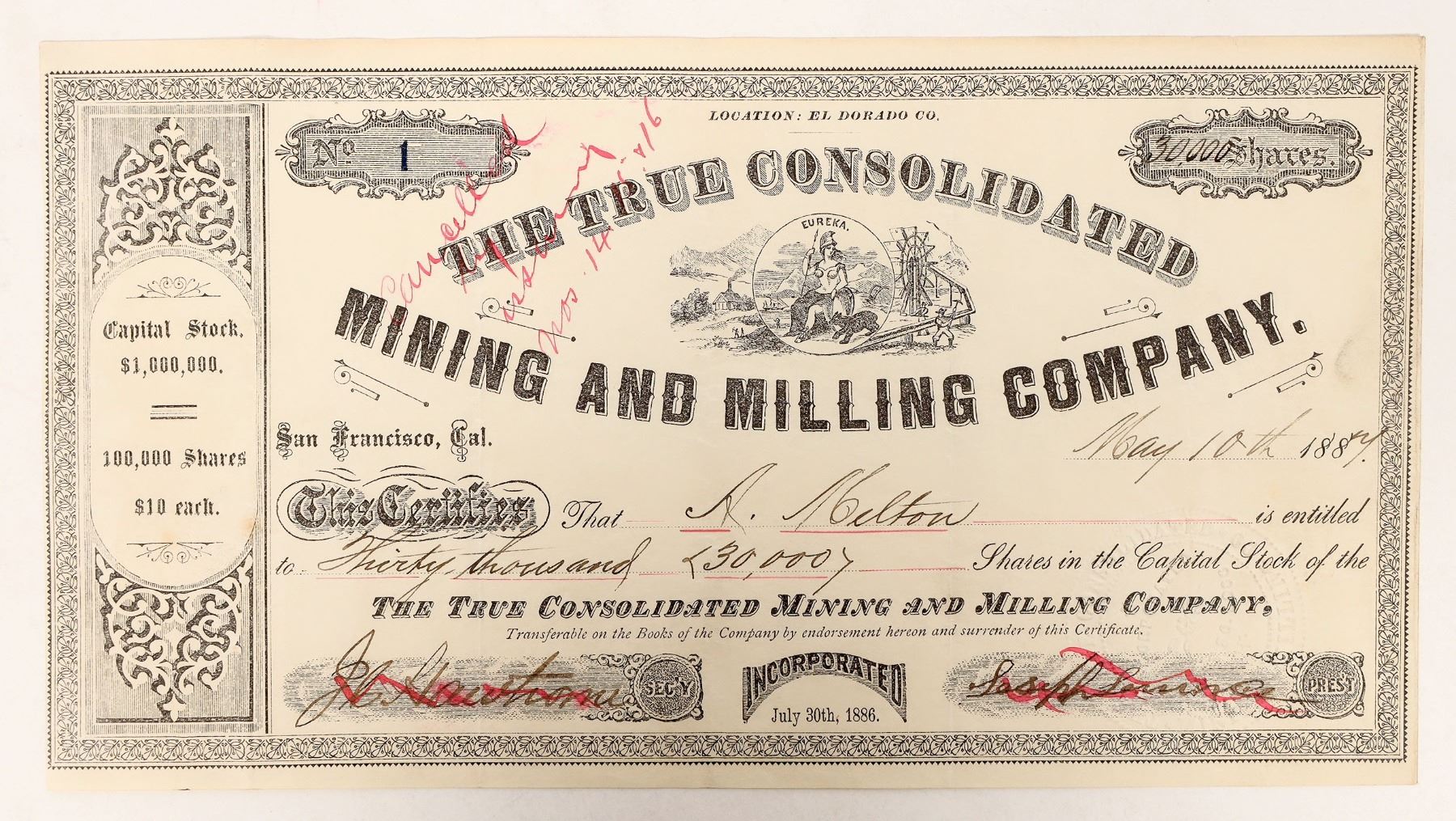 Issued 1887 The True Cons. Mining and Milling stock. Cert. #1 for 30,000 shares to a key investor. The work done by the True Consolidated in the 1880's and 90's lead to a shaft 560 ft. At the 115 ft. a prospect was claimed. The mine produced considerable gold (some estimates being as high as $250,000) during early operations. It was worked between 1870 and 1890. About 1895 these claims passed into the hands of Placerville Gold Mining Company. [Mother Lode Gold Belt of California By Logan]