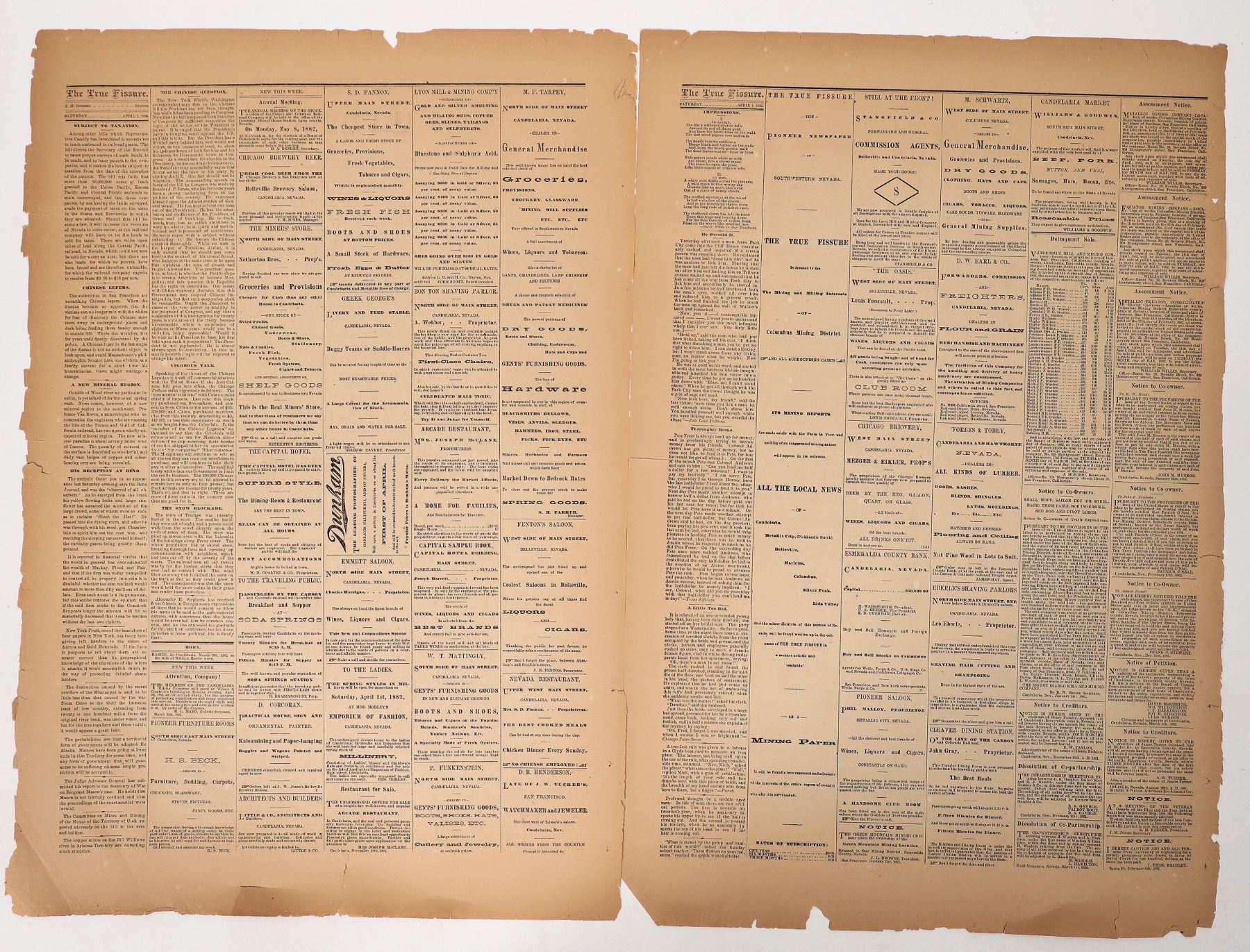 1882 The True Fissure newspaper in 2 large pages. Dealers in hair, explosives, Edison Electric Railway etc. 23x15", edge condition issues, please inspect. Rare Candelaria newspaper published 1880-86.