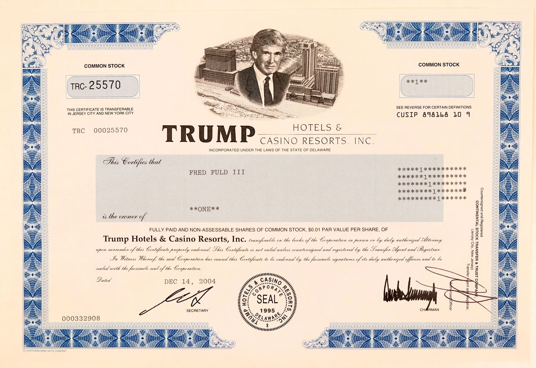 2004. Vignette of Donald Trump with casino in the background, plus the machine printed facsimile bold signature of Donald Trump. The only certificate with a vignette of a modern day president. Extremely fine. Company went defunct in 2017. For 1 share. No reserve.