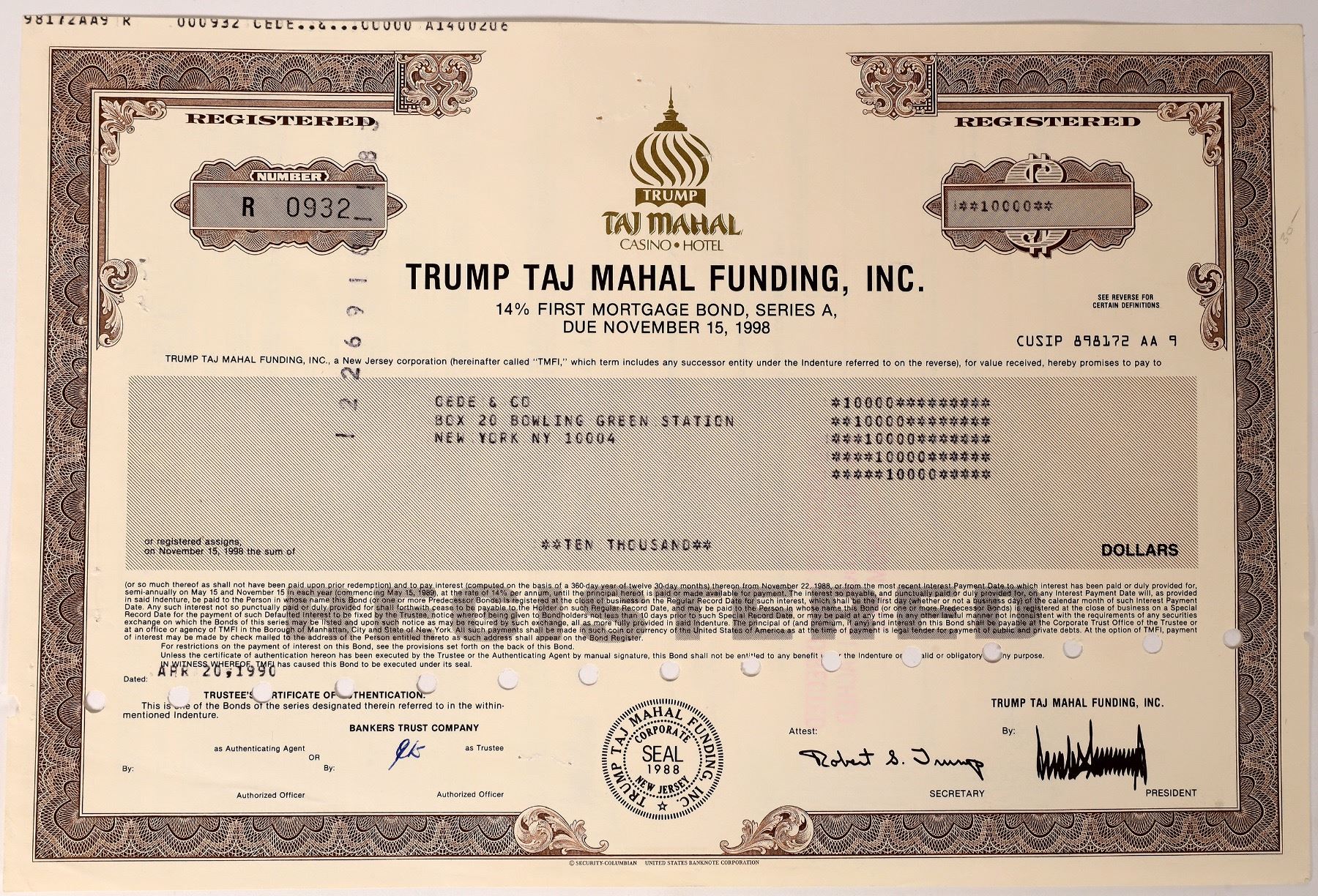 Lot of 2 issued first Mortgage bonds for Trump's Atlantic City endeavor. Number 609 for 10,000 shares in 1989 and no. 932 for 10,000 shares in 1990. Donald Trump's signature as president is autopenned. Punch cancelled. Brown border, black print, and gold logo. Trump's third property in Atlantic City was wrapped in controversy prior to opening because of its role, along with Resorts Casino Hotel, in the fight between Donald Trump and Merv Griffin in 1988. Trump bought the unfinished resort from Merv Griffin. The casino opened in 1990 as the Trump Taj Mahal and was the largest and highest grossing casino in the city until the opening of The Borgata in 2003.