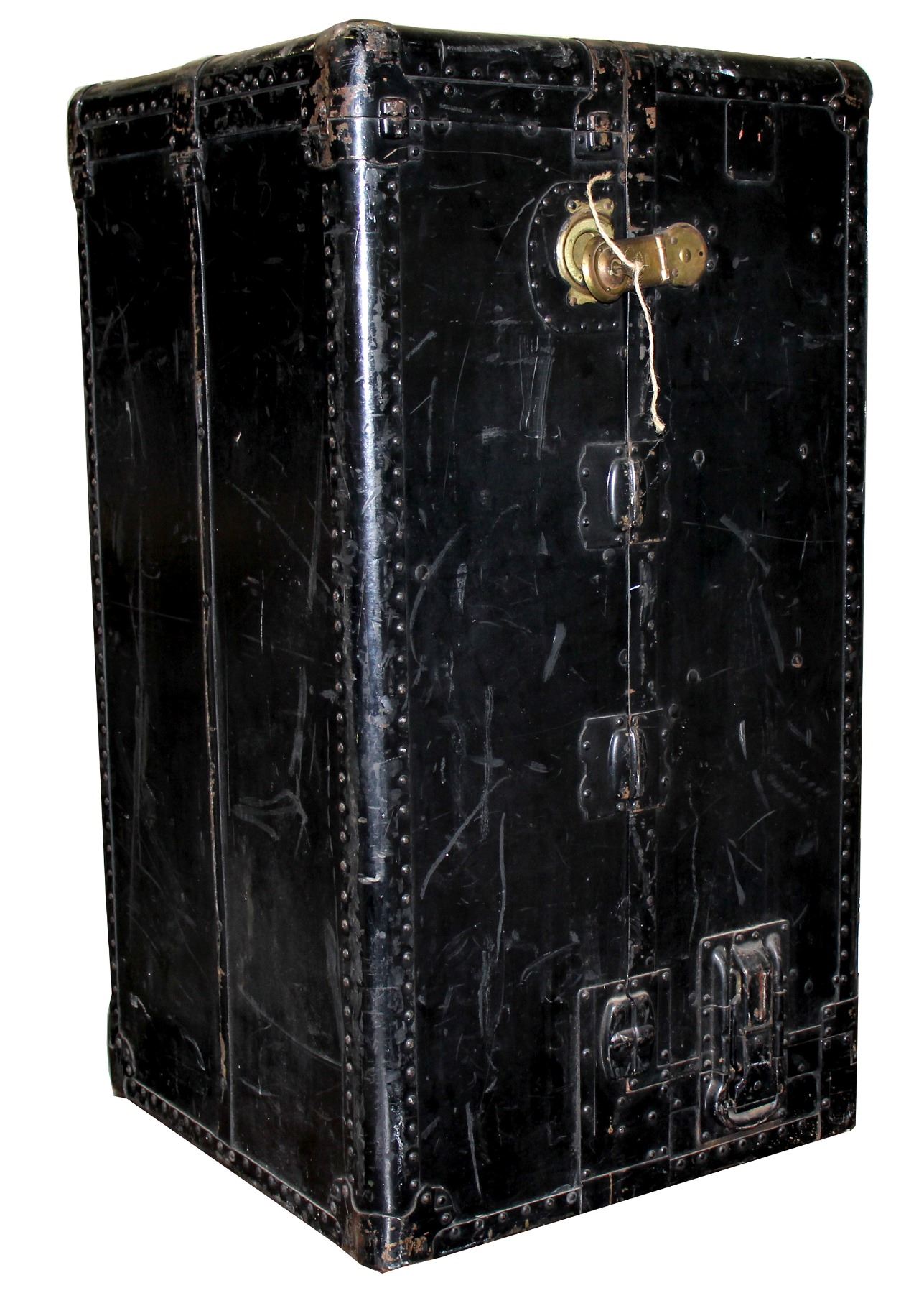 Here is a really nice item. It is an old time " Steamer Trunk". It was made by the Weary Trunk Company, that was started by George H Weary in the early 1920's-1930's. It was marketed as " The Weary Wardrola...The trunk that rolls open". This one is jet black in color, and has all the hardware and the matching key !! The lock was made by the Eagle Lock Company/ Terryville, Conn. Inside looks good but 2 of the four drawers missing. The outside is scuffed up. but could be redone...easily. 41 " High x 23" wide x 22 1/2" depth. Hangers and 2 old belts found inside, included. A little dab of paint will do it...would make a nice coffee table or storage trunk for your man cave.