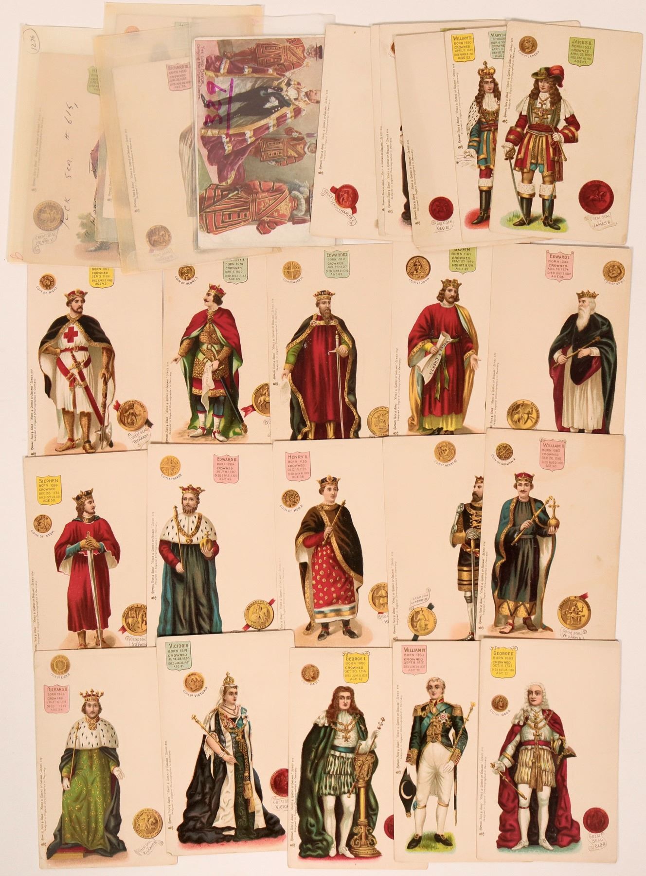 Lot includes two different Tuck series of Kings and Queens of England. The Tuck series 816 with 12 cards and the Tuck series 614. The highlights are two cards featuring the Coronation of King Edward VII. These are very colorful artistic renderings. See photos.