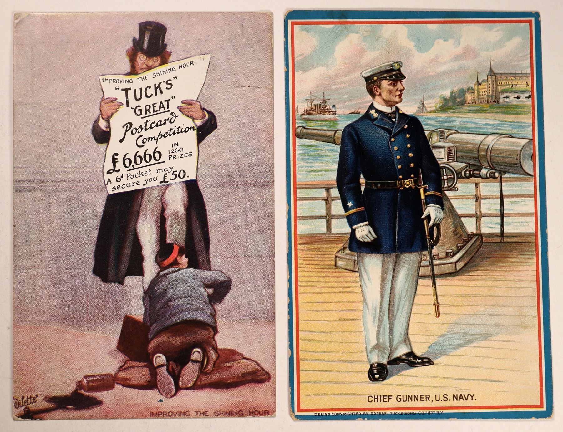 Tuck's postcards, include the U.S. Navy series Chief Gunner raised relief, blank. Also included is the Tuck's Great Postcard Competition. Used & postmarked. Tuck's was the Royal Postcard Printer to the King & Queen.[ London United Kingdom