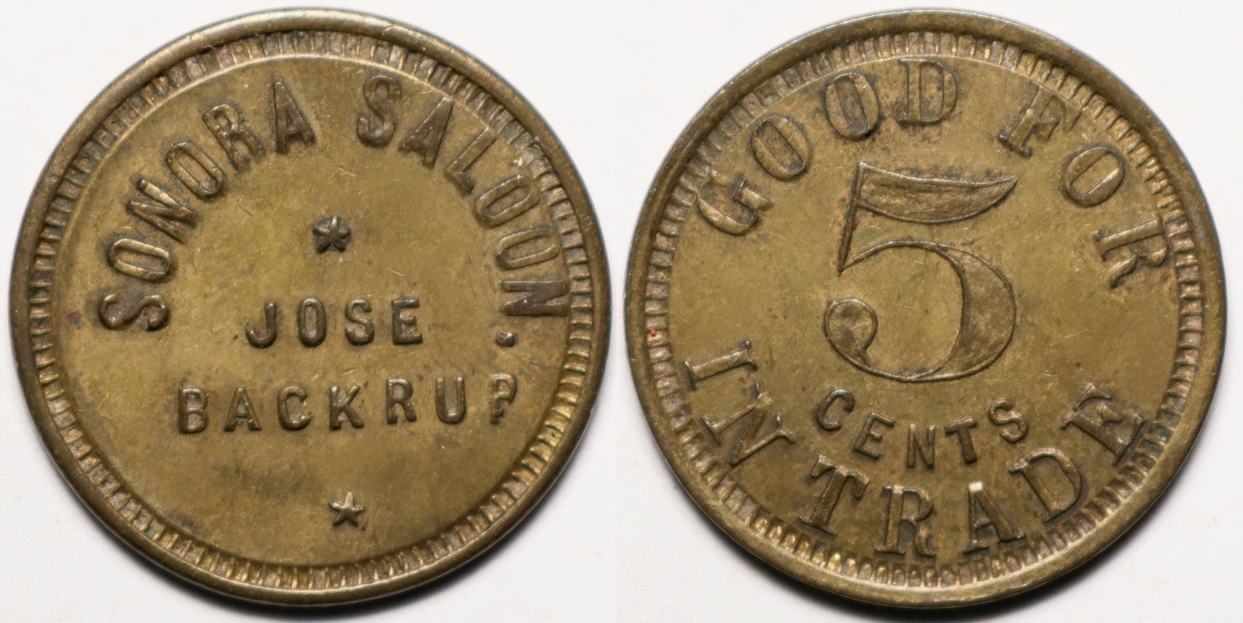 Sonora Saloon / Jose / Backrup // Good For / 5 / cents / In Trade. R10. Round br.