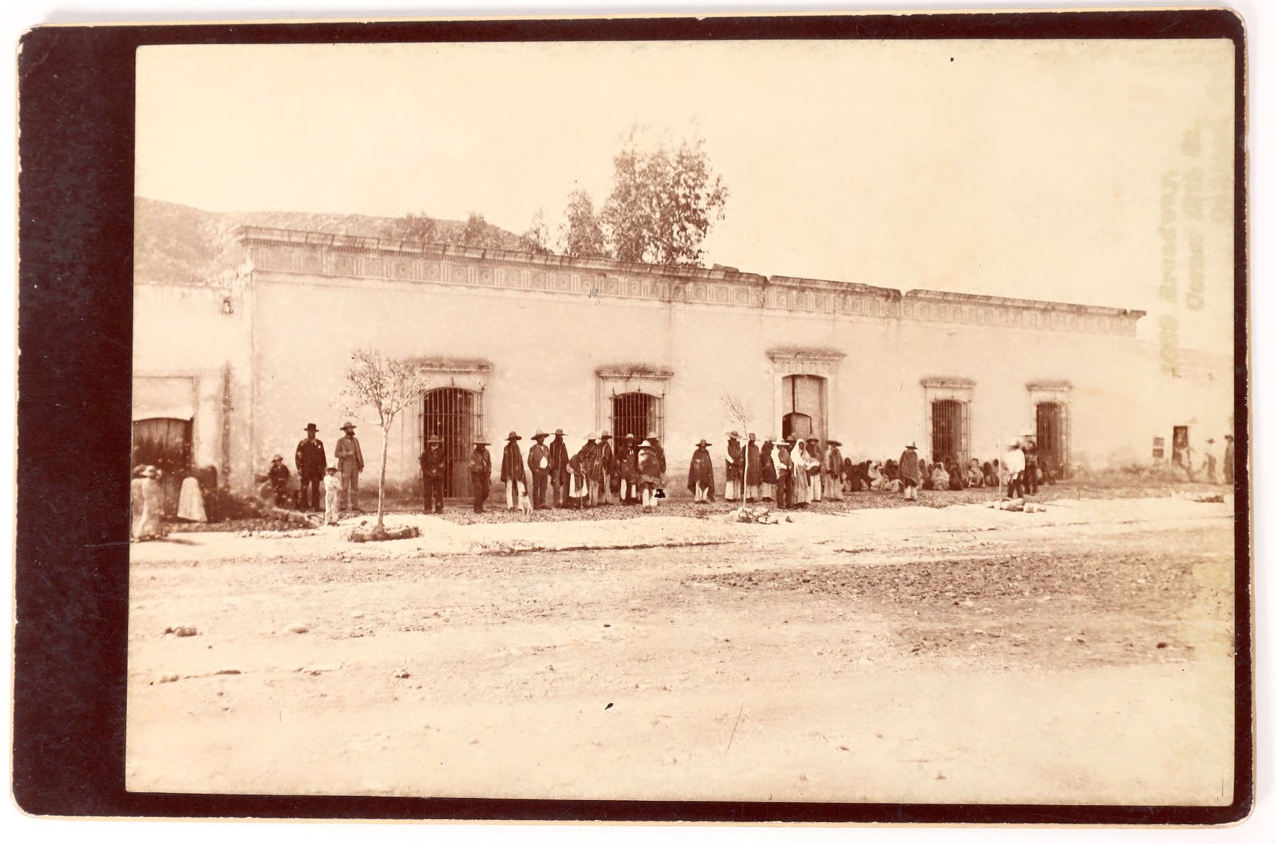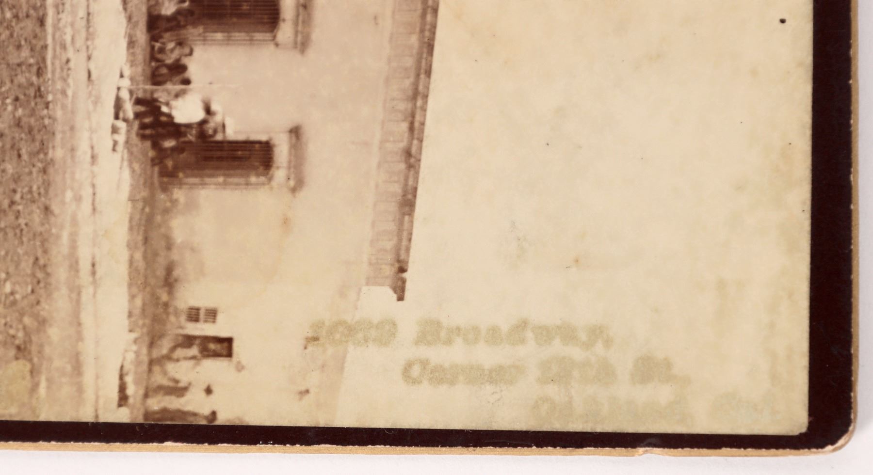 c. 1885 Tucson street scene photo with many people in front of a building, corner of Broadway and 13th. 4x5.75". Tucson Arizona