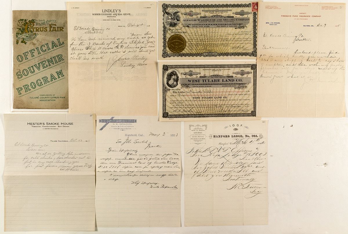 Lot of 8. 1) Two stocks: West Tulare Land Co. (issued 1931, not cancelled) and Alpaugh Warehouse and Milling Co. (issued 1915, not cancelled). 2) Official Souvenir Program for The 7th Tulare County Citrus Fair in 1916. 24 pages with many ads. Soiling/stains. 3) Letterheads for: Hester's Smoke House (Tulare, 1915, to El Dorado Brewing Co.), N.M. Rafailovich (Hanford, 1893), Hanford IOOF (1882), Fireman's Insurance Co. of SF (Sultana, 1915), and Lindley's Business Exchange and Real Estate (Dinuba, 1913). (Prag Collection) City: Tulare County State: California Date: 1882-1931 ID# 34005