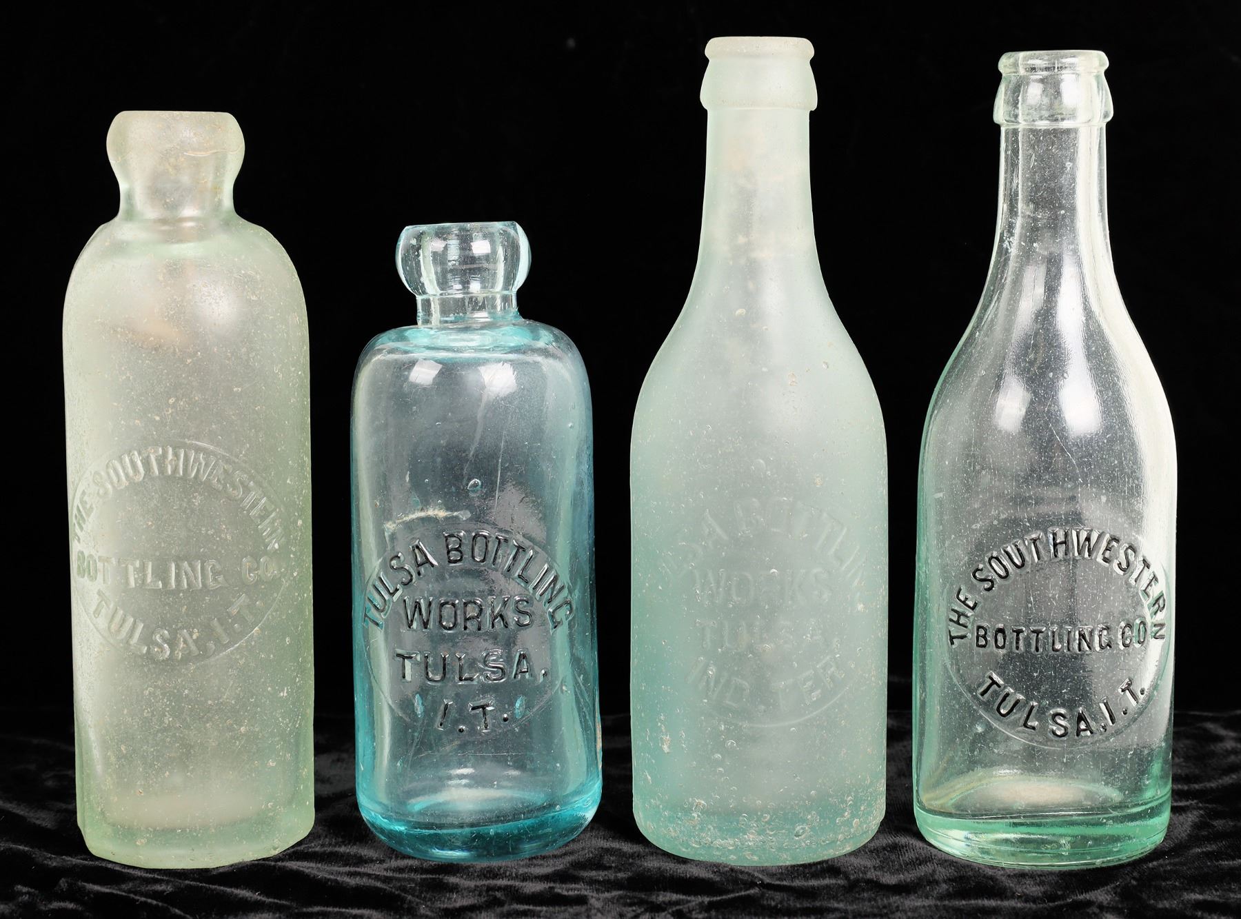 4 Tulsa, Indian Territory soda bottles. Black embossed Tulsa Bottling Works, 6", 1" overflow on lower seam. Tulsa Bottling Works crown top 7.75", .75" side indent. The Southwestern Bottling Co. 7". Black embossed The Southwestern Bottling Co. 7.5" crown top. No apparent chips or cracks. Tulsa Indian Territory