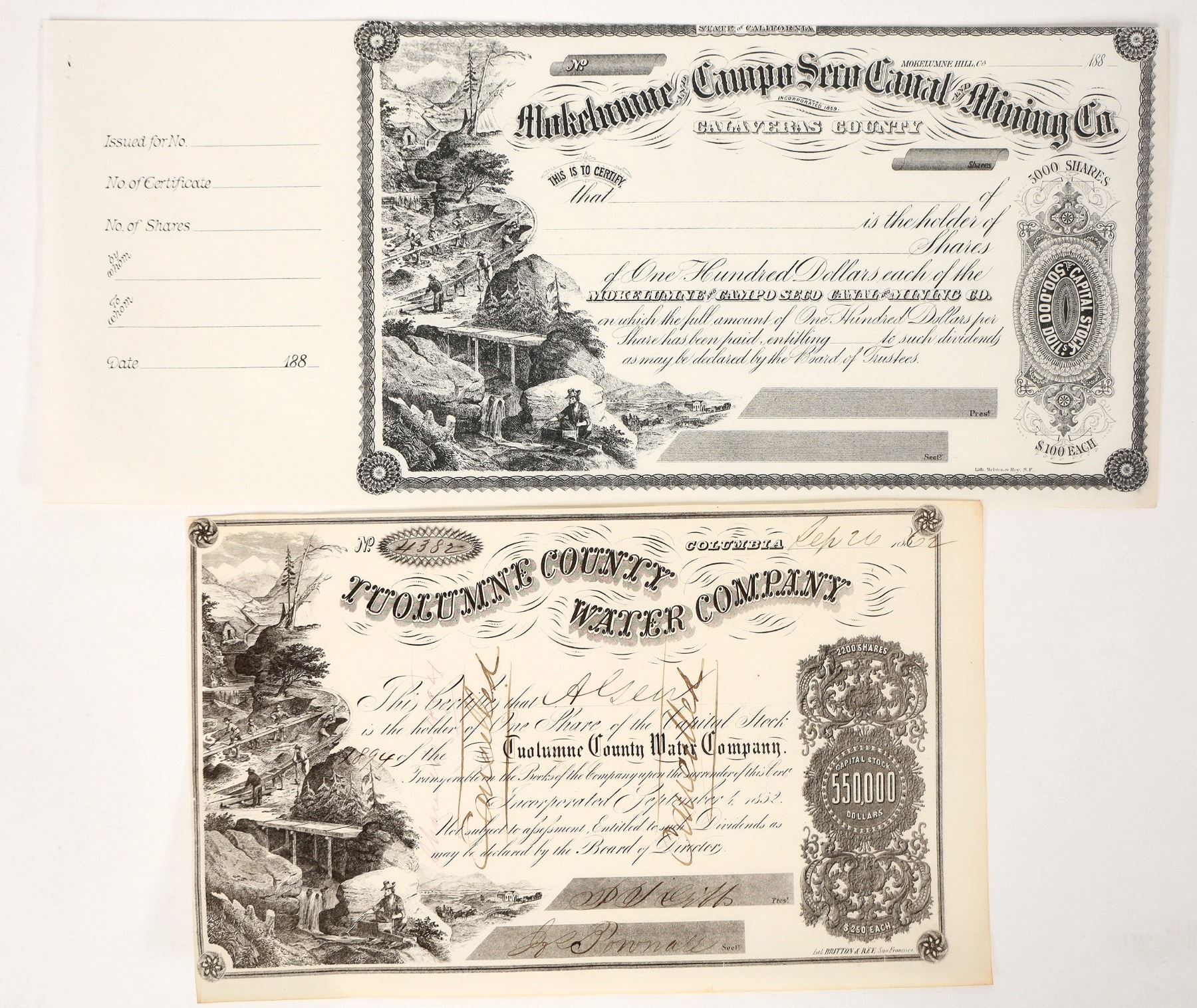 Stock certificates, one issued, one blank, from the Tuolumne County Water Company of Columbia, California. One is issued to (illegible) of 1,894 shares at $250 per share. It was issued September 4, 1852. The other cert is unused and in very nice condition. Please see photos for more details. This is an early Britton & Rey Lithograph. Please see photos for more details.