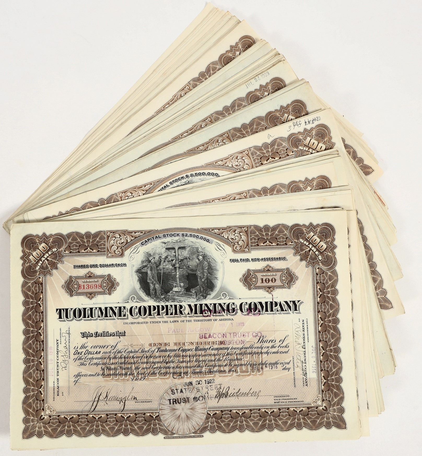 Lot of approx. (+200) Tuolumne Copper Mining Company certificates from the Arizona Territory. Cancelled, signed and numbered, fully executed on the reverse. Great border graphics, embossed seal at bottom, please see photos.