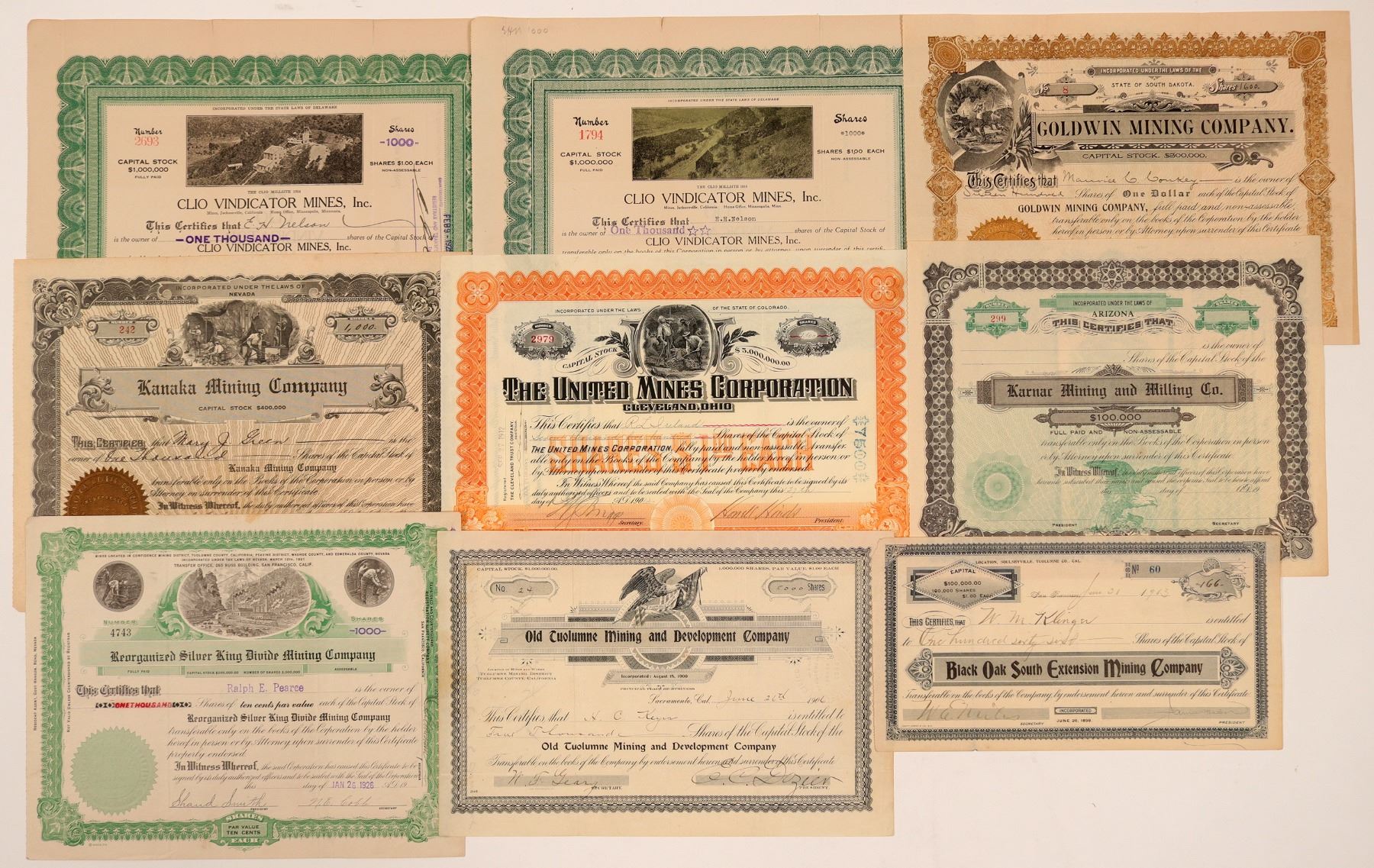 Lot of 9, mostly different. Included: United Mines Corp. (1912, mining vignette); Karnac Mining & Milling Co. (unissued); Goldwin MC (1904, mining vignette); Clio Vindicator Mines, Inc. (two issued in 1923 and 1925, photo vignette of mine); Reorganized Silver King Divide MC (1926, mining vignettes); Old Tuolumne Mining & Development Co. (1906, eagle vignette); Black Oak South Extension MC (1913, Soulsbyville); and Kanaka MC (1926, mining vignette). Fair to good condition. Please inspect. Ken Prag Collection