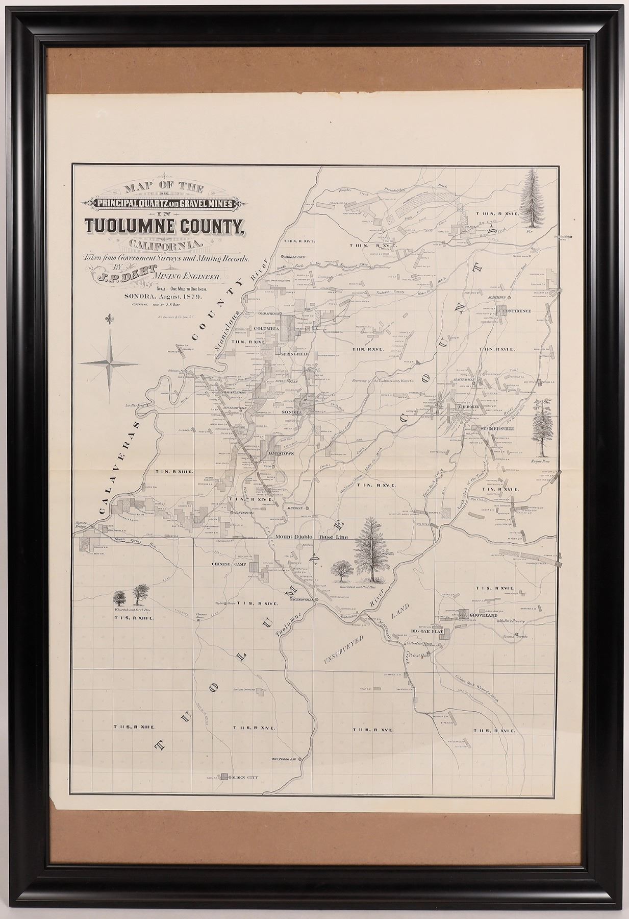 Choice and important early map of Tuolumne county mines printed by Bancroft, SF. with data by J. P. Dart. The map shows the holdings of various mining companies along this important section of the original California motherlode. It also has pictorial representation of timberlands. The map centers on Sonora and Jamestown with Cherokee and Summersville on the far right, Groveland near the bottom. Strong horizontal fold at center. This map is more important that the more common version which does not show outlines of the companies various claims and holdings. It is an excellent gold rush gold location map. The map measures 34.5 x 26.5" overall frame size 30 x 43"