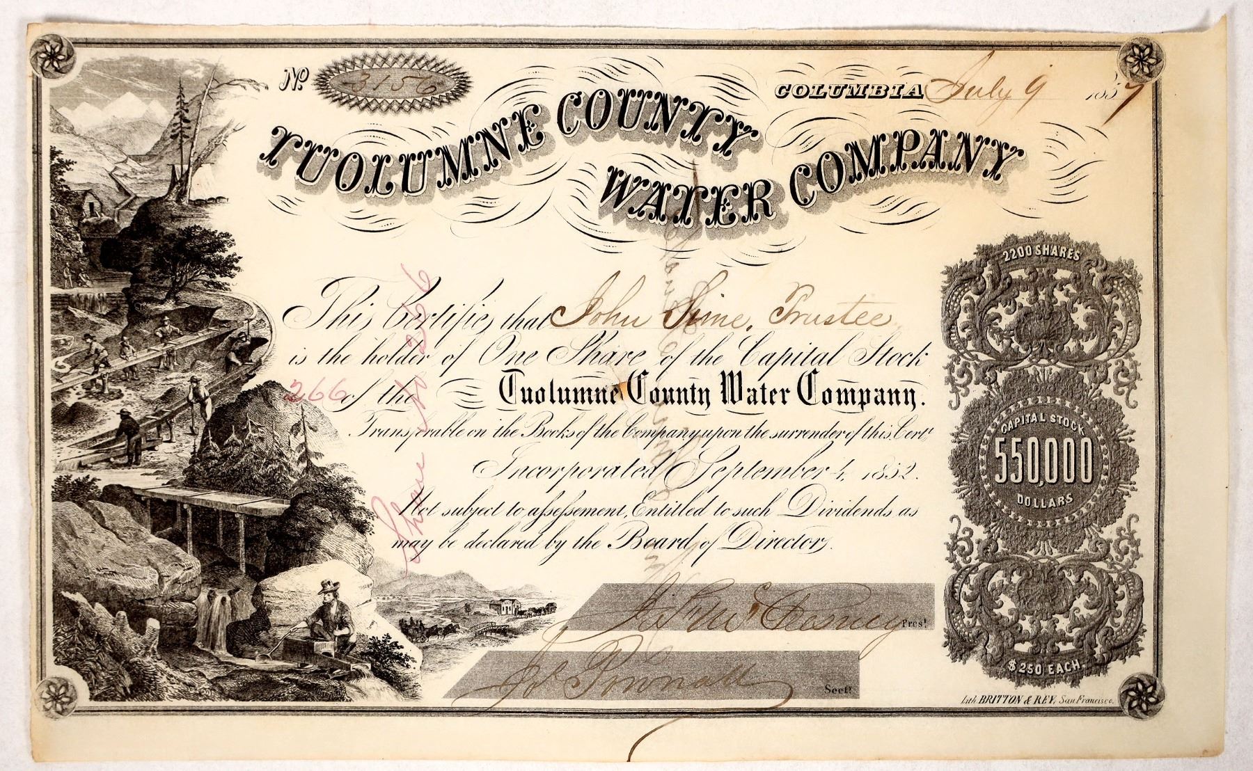 Issued 1859 Tuolumne Water Co. stock issued to and signed on verso by John Sine, who became a major San Francisco banker.