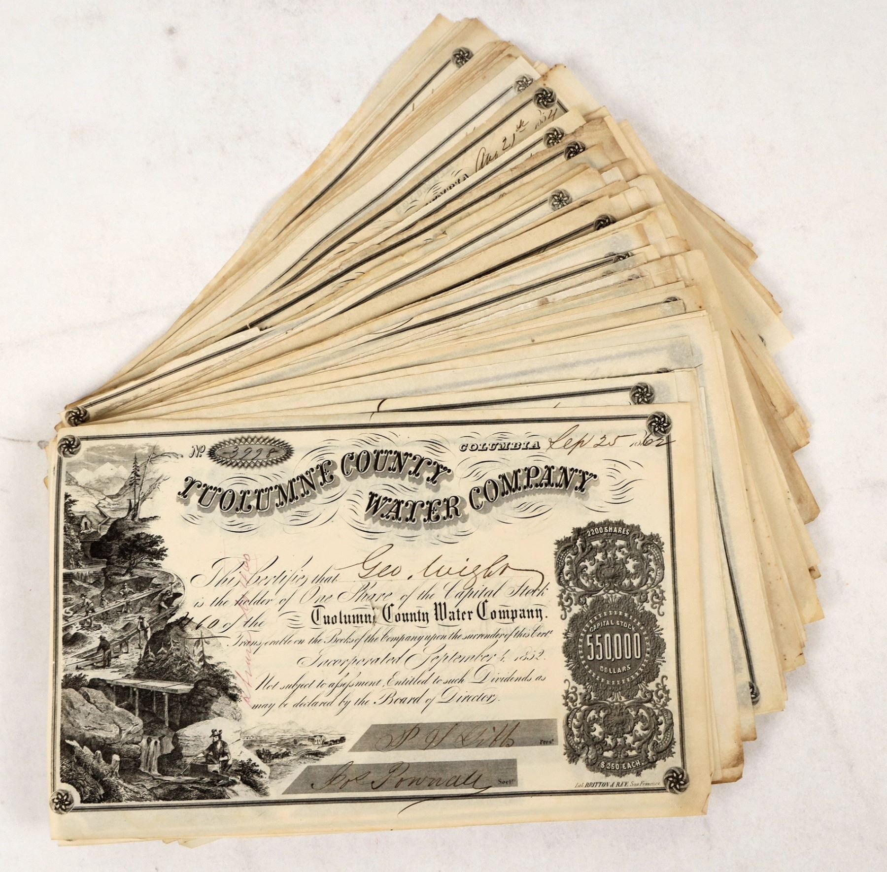 Group of approx. 160 stock certificates from the Tuolumne County Water Company of Tuolumne County, California, issued 1853 to 1862. All issued and cancelled with X-shaped cut at center. Design features an excellent, large vignette of workers at a river. 10"x6" certs, notable toning/some foxing; see photos.