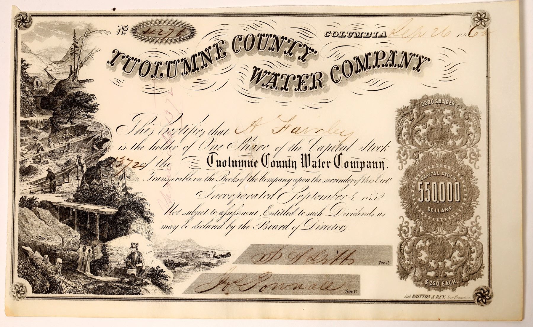 Cert # 4279, dated Sept? 26, 1862. Issued to A Farley (found in Bancroft V 358), Anderson Farley was a member of the California Batallion and left for the Gold Rush. The Tuolumne Water Company was Incorporated in1852 and was a supplier of water for mining and sluicing operations near Yosemite.