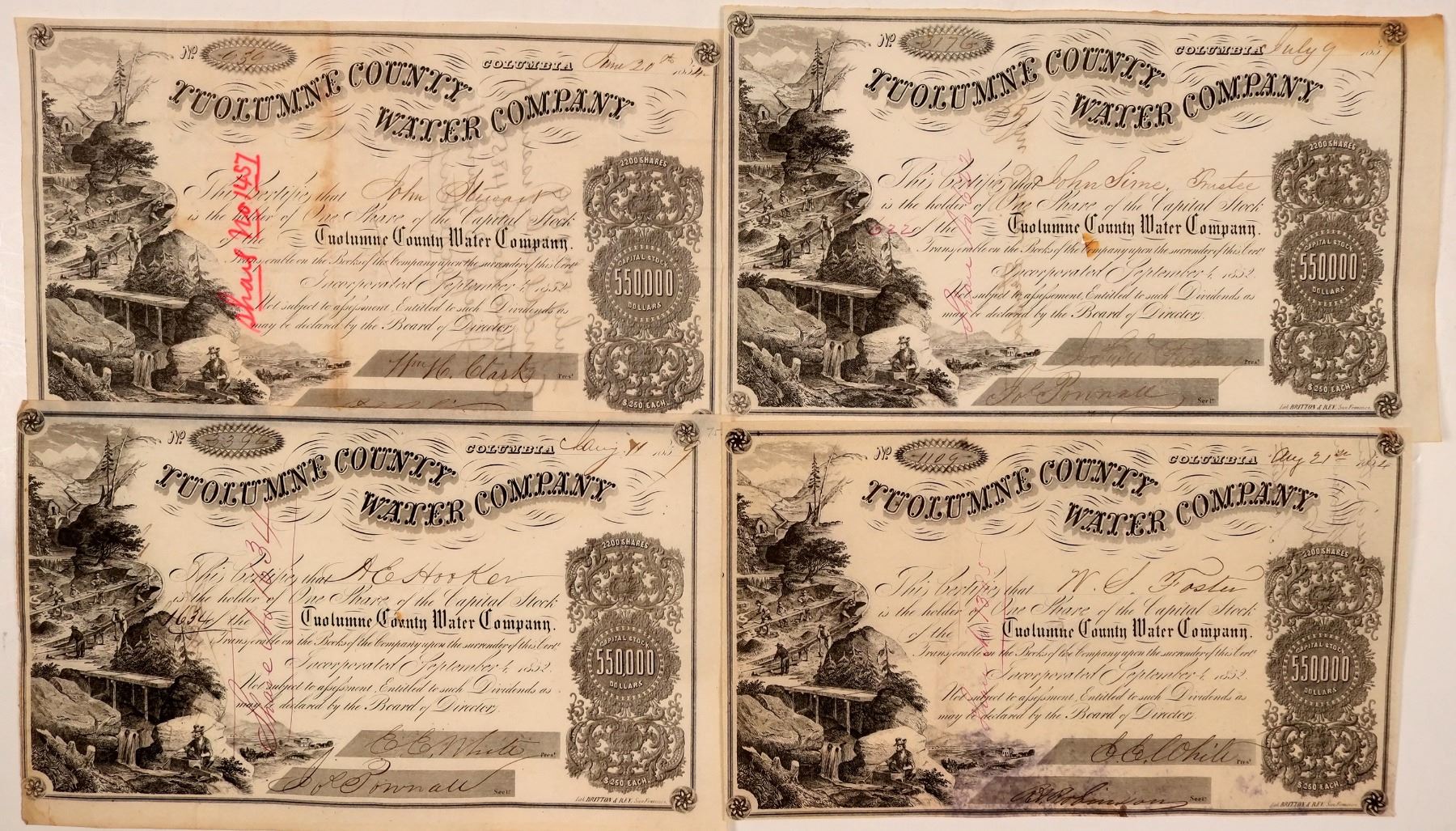 Emigrants who rushed to California after the discovery of gold in 1848 discovered an environment whose climate and geography were sharply different from home. It cycled between periods of wet and dry, drought and flood and quickly emphasized the importance water management. As well as its domestic importance, large quantities of water were essential to large scale mining operations and the control of water became key. Miners were tied to the area by the availability of water, which eroded the gold from the mountains and deposited it in Columbia. Soon the control of water became the biggest and most complex struggle facing miners, and Columbia epitomized this struggle. The Hildreth party has been given the credit for discovering gold in the area, although other evidence points toward a small settlement of miners from Mexico. Nevertheless, the Americans moved in quickly once they heard of the plentiful gold and a ready supply of water. After their arrival in March 1850 a typical hot and dry summer followed. Winter brought miners back to the Columbia area following the rains and the return of the seasonal creek. Those merchants who managed to survive the summer quickly realized that maintaining their business relied on a steady supply of water, and local miners realized that a reliable supply of water was needed to find the gold all year around in this location. Together, they established to Tuolumne County Water Company (TCWC) in June of 1851. The Tuolumne County Water Company was set up as an employee owned and controlled company. Founders went to surrounding areas raising expectations and investors. At the end of June 1951, 160 shares of stock had been sold, the route had been surveyed, and workers were celebrating. Their efforts to tap into first Five Mile creek, then the south fork of the Stanislaus River was largely unsuccessful, as the creeks were dry and the rivers were low as was usual in the summer months. After almost a year water finally arrived, but there was not enough to sustain full mining operations, and the company was forced to borrow money for capital investments in sawmills, roads and equipment. The Tuolumne County Water Company incorporated in Septem
