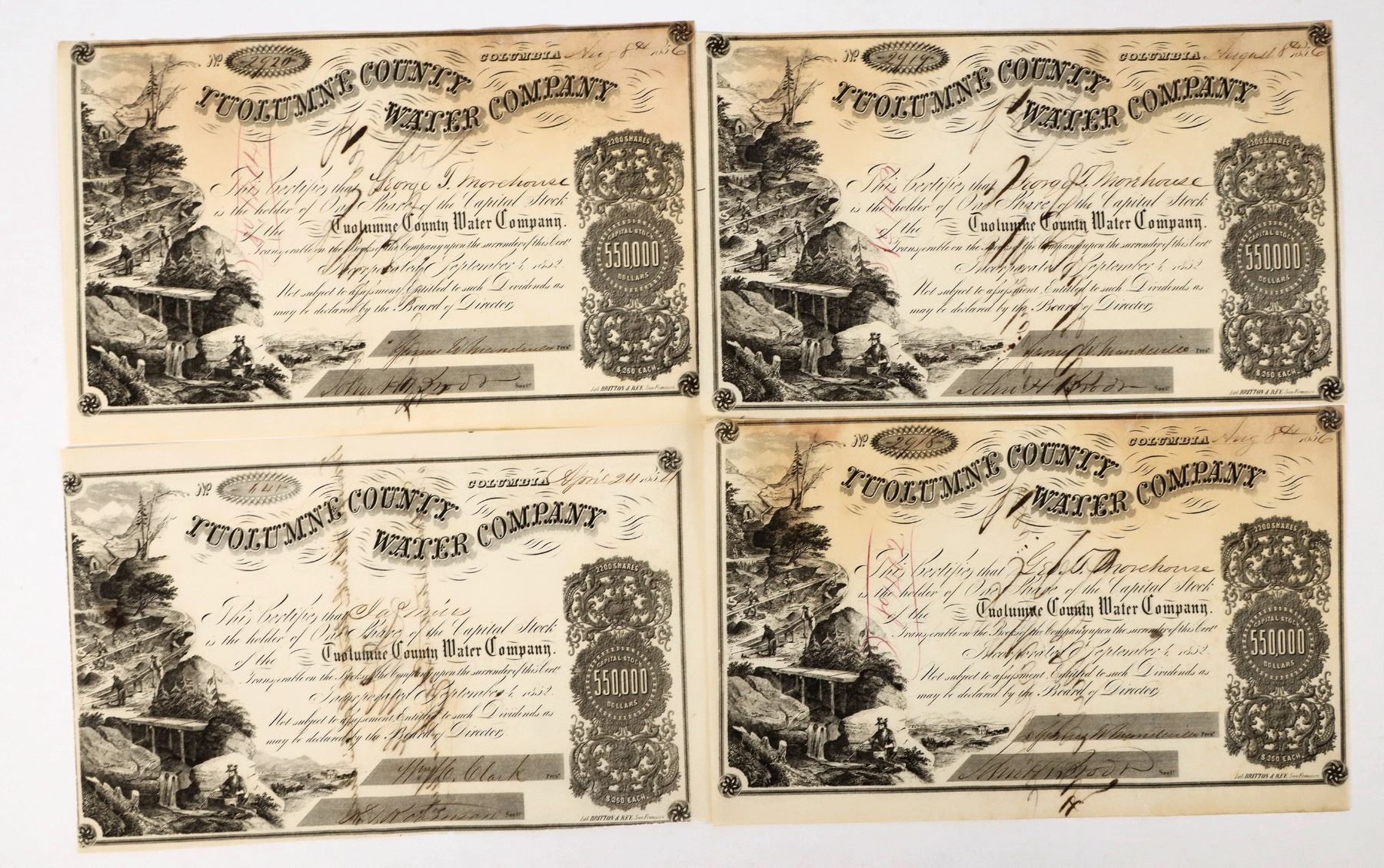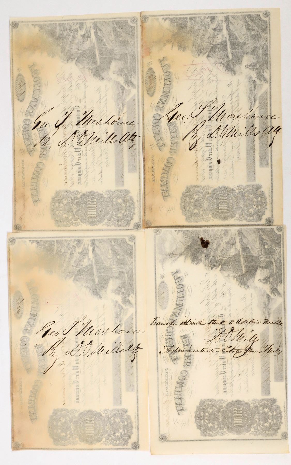 Lot of 4 stocks issued 1854-56 in Columbia. All are signed on the reverse by DO Mills. Fantastic sluice mining vignette by Britton & Rey. Darius Ogden Mills (1825–1910) was an American banker, industrialist, and philanthropist who played a major role in the economic development of California during and after the Gold Rush. Originally from New York, he moved west in 1848 and founded the National Gold Bank of D. O. Mills & Co. in Sacramento, becoming one of the region's most influential financiers. Mills invested heavily in railroads, mining, and utilities, and later helped establish the Bank of California, which became a cornerstone of Western finance. Known for his prudence and integrity, he accumulated a vast fortune while maintaining a reputation for stability during volatile economic times. In his later years, Mills devoted much of his wealth to philanthropy, supporting education, libraries, and public institutions both in California and New York.
